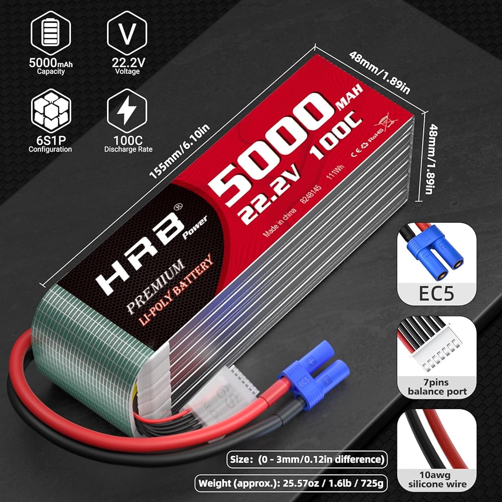 6s 5000mah lipo battery Size(L*W*H): 6.10*1.89*1.89in / 155*48*48mm (0 - 3mm difference), Weight: 1.6lb / 25.57oz / 725g (± 10g)