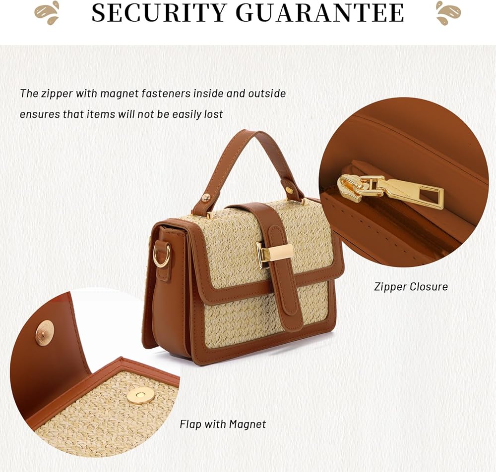 - جرّب المزيج المثالي بين الموضة والعملية مع حقيبة اليد الأنيقة هذه المصنوعة من القش، وهي إكسسوار يجب على كل امرأة اقتناؤه.
