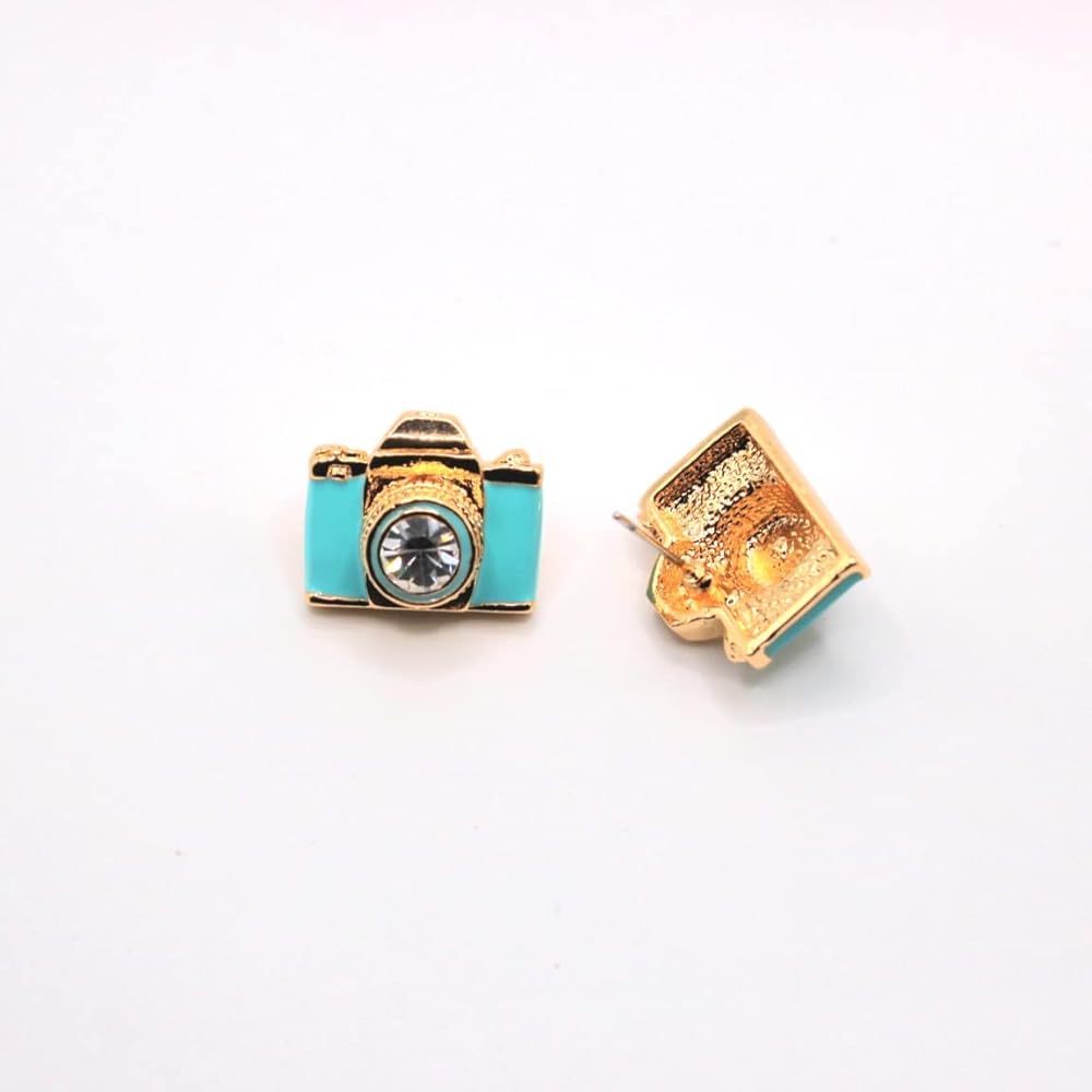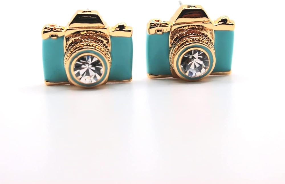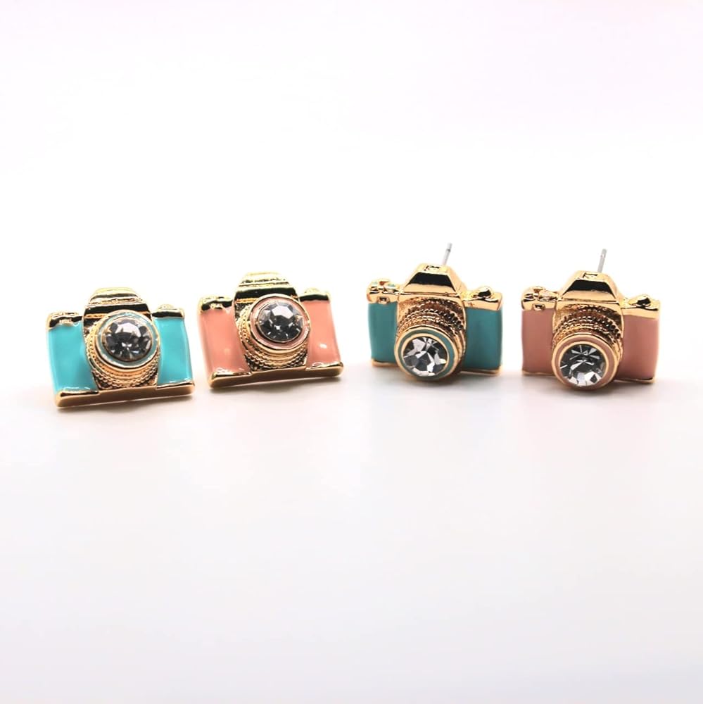 أقراط الكاميرا الذهبية | مجوهرات المصور الوردي الأزرق | عدسة حجر الراين الرجعية الرائعة | أفكار هدايا فريدة | سحر جميل النساء الفتيات