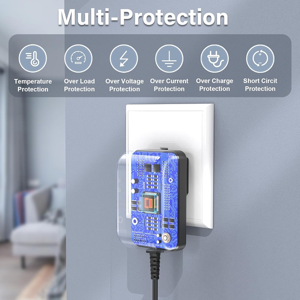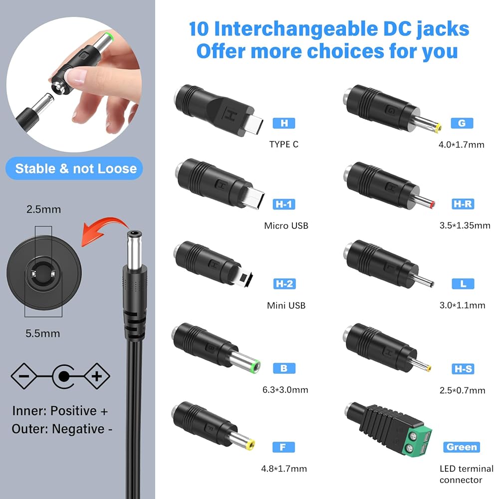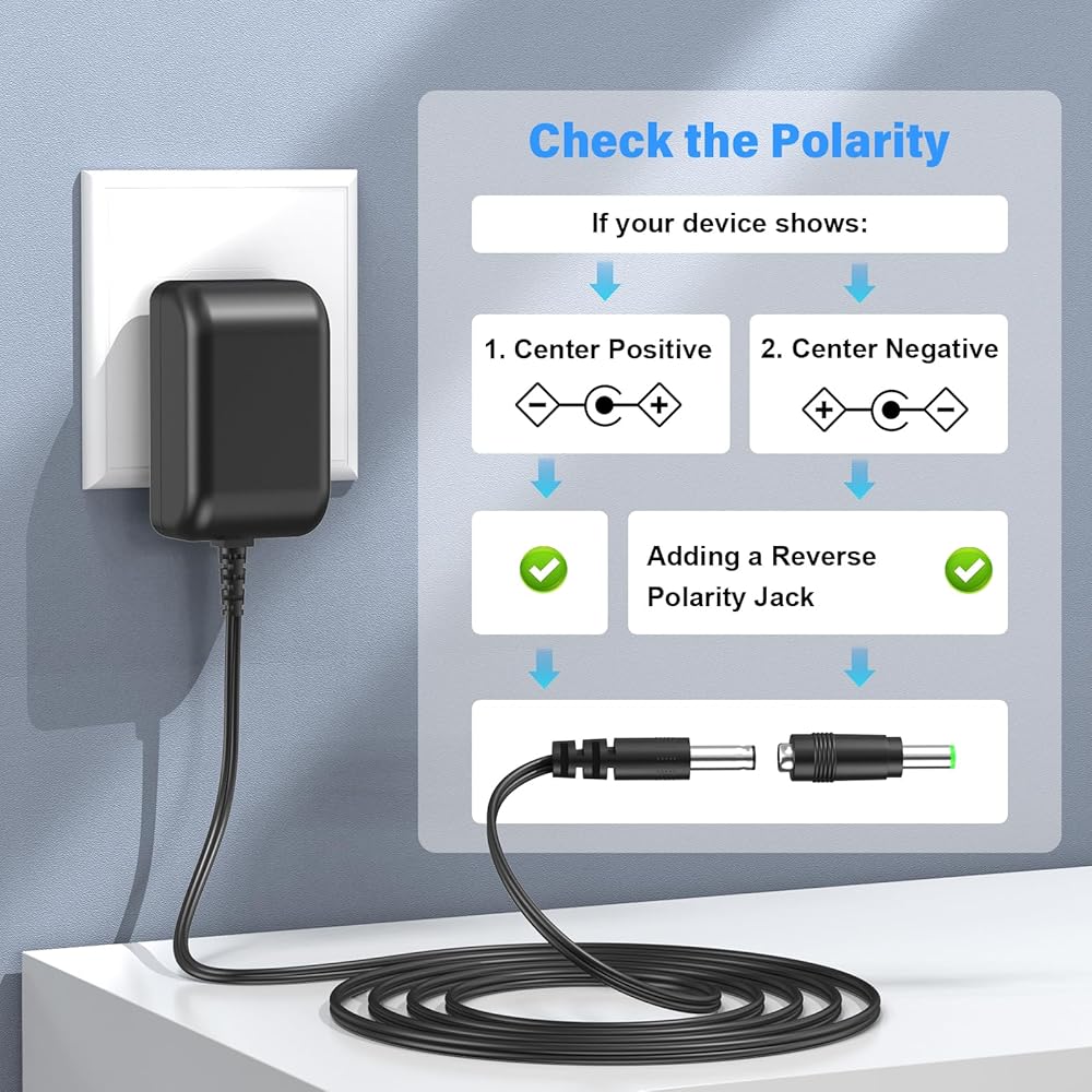تيار متردد الإدخال 100-240 فولت - 50/60 هرتز 0.3 أمبير، نطاق جهد الإدخال العالمي، قابس حائط قياسي أمريكي، سلك طاقة طويل بما فيه الكفاية بطول 6.0 أقدام/1.8 متر، قطبية التيار المستمر: ⚠️إيجابي داخلي (+)، ⚠️سلبي خارجي (-).