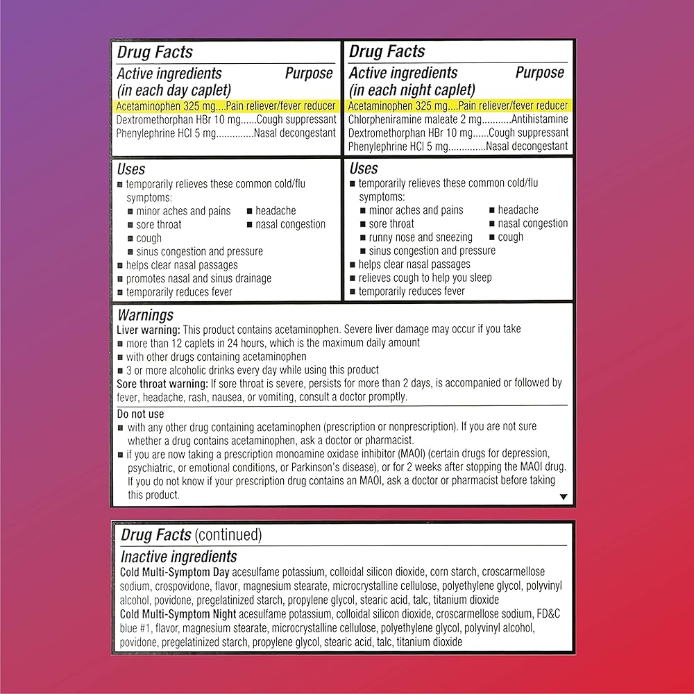 • يحتوي على 8 كبسولات ليلية تحتوي على 325 ملغ من الأسيتامينوفين (مخفف الألم ومخفض الحمى)، 10 ملغ من ديكستروميتورفان HBr (مثبط للسعال)، 5 ملغ من فينيليفرين HCI (مزيل احتقان الأنف)، 2 ملغ من كلورفينيرامين ماليات (مضاد للهستامين).