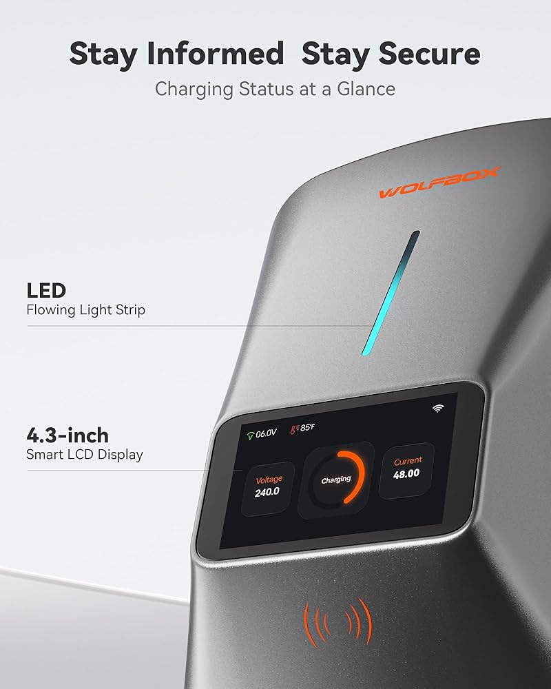 • التحكم الذكي والإدارة السهلة: تعرض شاشة LCD مقاس 4.3 بوصة معدل الشحن والوقت والجهد والمبلغ المشحون، لذا ابق على اطلاع بتقدم شحن سيارتك الكهربائية وحالتها. يوفر شاحن EV الذكي سهولة تسجيل الدخول باستخدام حساب Google الخاص بك. فهو يتكامل بسلاسة مع ALEXA وGoogle Assistant للتحكم الصوتي. كما أنه يسهل مشاركة الجهاز بسهولة ويسمح لعدة مستخدمين في منزلك بالتحكم فيه في وقت واحد.