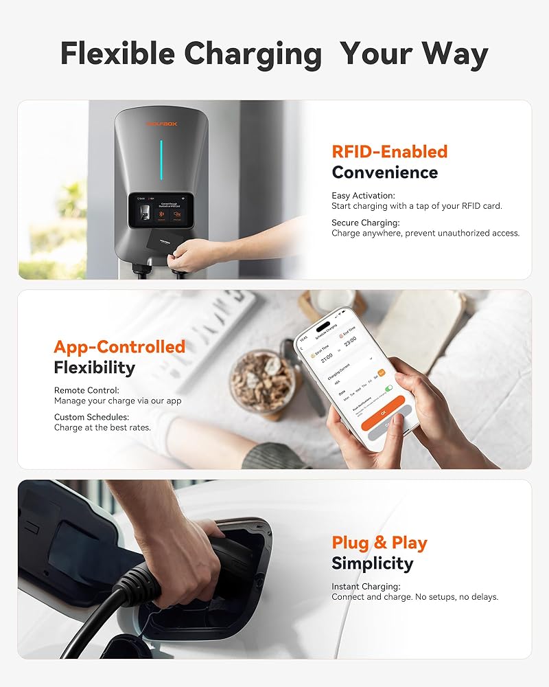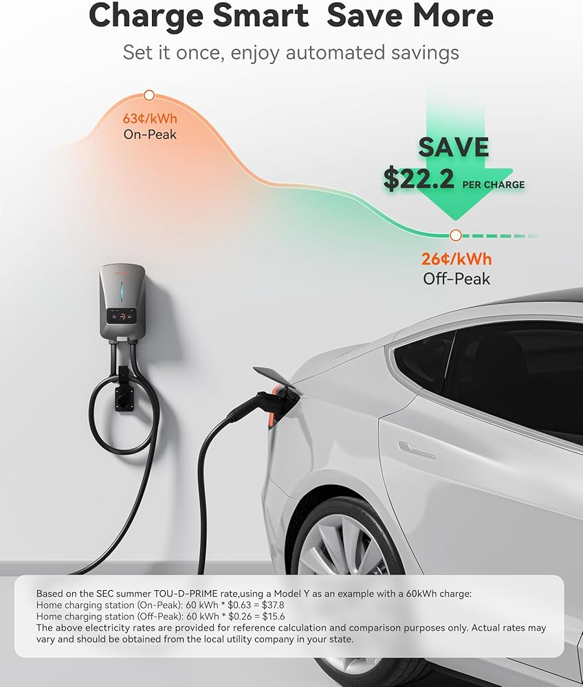 • شحن أسرع وتوفير أقصى قدر من التوفير: يوفر شاحن السيارة الكهربائية سرعة أعلى بمقدار 7 مرات من شواحن EV من المستوى 1، مما يوفر نطاقًا مذهلاً يصل إلى 37 ميلاً في ساعة واحدة فقط. يدعم شاحن EV للمنزل إدارة التطبيقات واتصال Wi-Fi، ويمكنك ضبط الكثافة الحالية وجدولة وقت الشحن ومراقبة بيانات الشحن في الوقت الفعلي. تحديد وقت الشحن المجدول خارج ساعات الذروة يقلل من فواتير الكهرباء ويوفر لك المال!