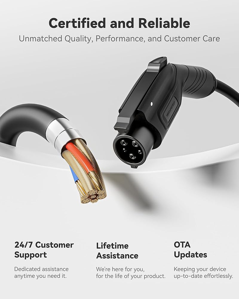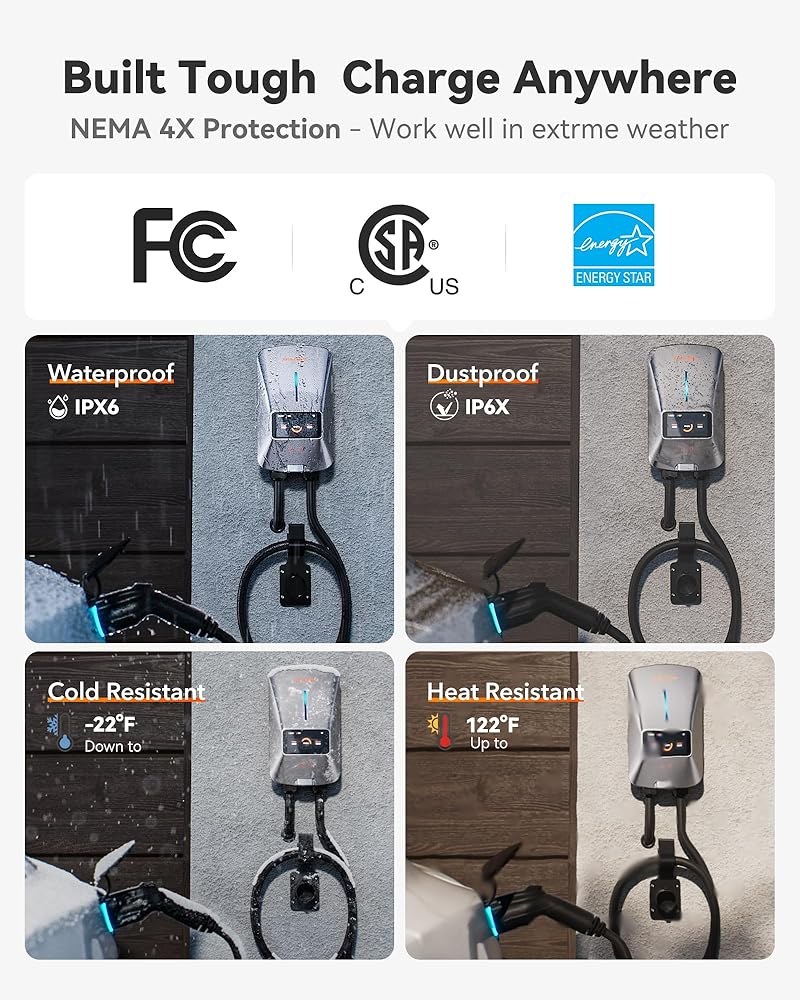 • معتمد من CSA ونوع NEMA 4: شاحن السيارة EV معتمد من CSA ويلبي معايير السلامة UL (معيار UL2594). يمكنك أن تكون واثقًا من سلامة وموثوقية محطة الشحن السريع. تم تصميم شاحن EV بقوة 40 أمبير بغطاء حماية قوي مقاوم للماء NEMA 4، مما يجعله مرنًا في مواجهة التأثيرات الخارجية. يأتي مزودًا بكابل عالي الجودة بطول 25 قدمًا، مما يمنحك راحة البال عند الشحن في جميع الظروف الجوية.