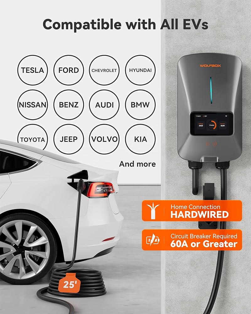 • التوافق العالمي والتركيب الموصى به: شاحن EV المثبت على الحائط متوافق مع جميع موديلات السيارات الكهربائية J1772. للحصول على الأداء الأمثل والسلامة، نوصي بتثبيت شاحن EV من المستوى 2 بقدرة 40 أمبير على قاطع دائرة مصنف بـ 50 أمبير أو أعلى. يرجى استشارة كهربائي محترف للتثبيت. بالإضافة إلى ذلك، يمكنك الاتصال بخدمة العملاء للحصول على محول Tesla. (المحول ASIN: B0CLLTWG2S) ملاحظة: يجب أن تكون سيارات Tesla EVs مجهزة بمحول خاص لتكون متوافقة.