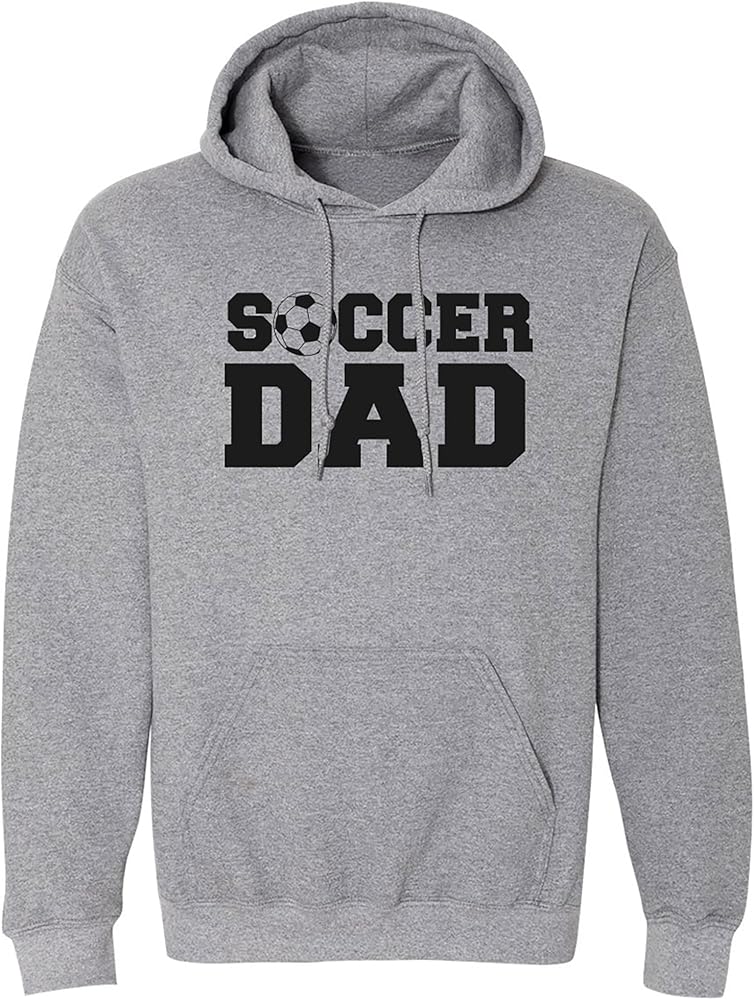 This sporty shirt features the text "Soccer Dad" with an image of a Soccer ball on the front in black on an Adult Hooded Sweatshirt. 50/50 Poly/Cotton Hooded Sweatshirt. Double-lined hood and drawstring. Double-stitched pouch pocket. Set-in sleeves, 1x1 athletic rib with Lycra.