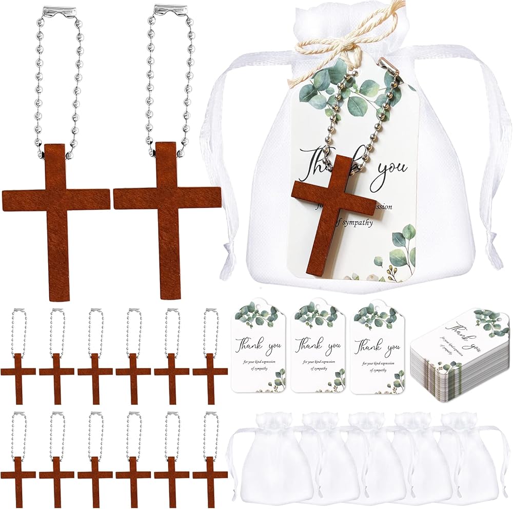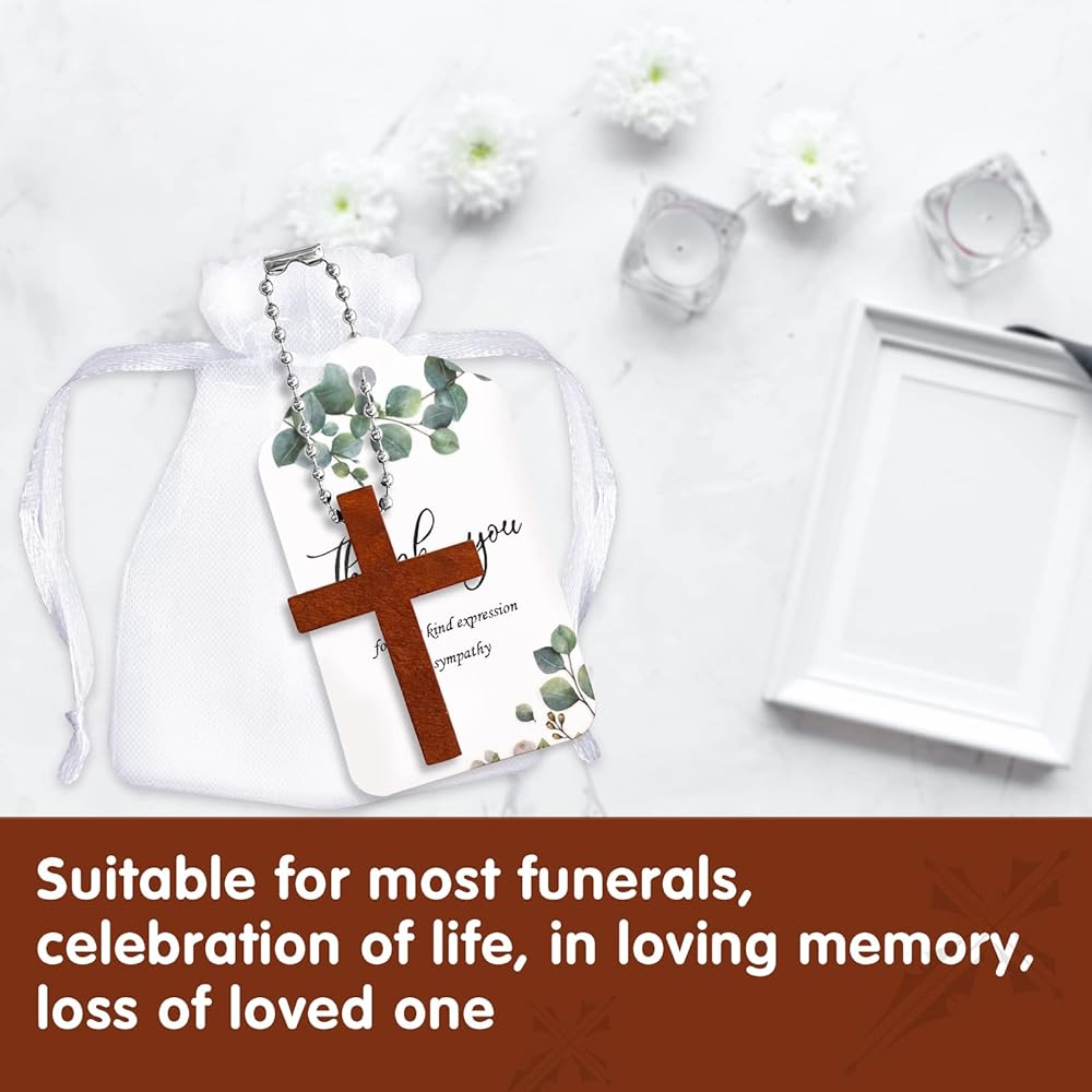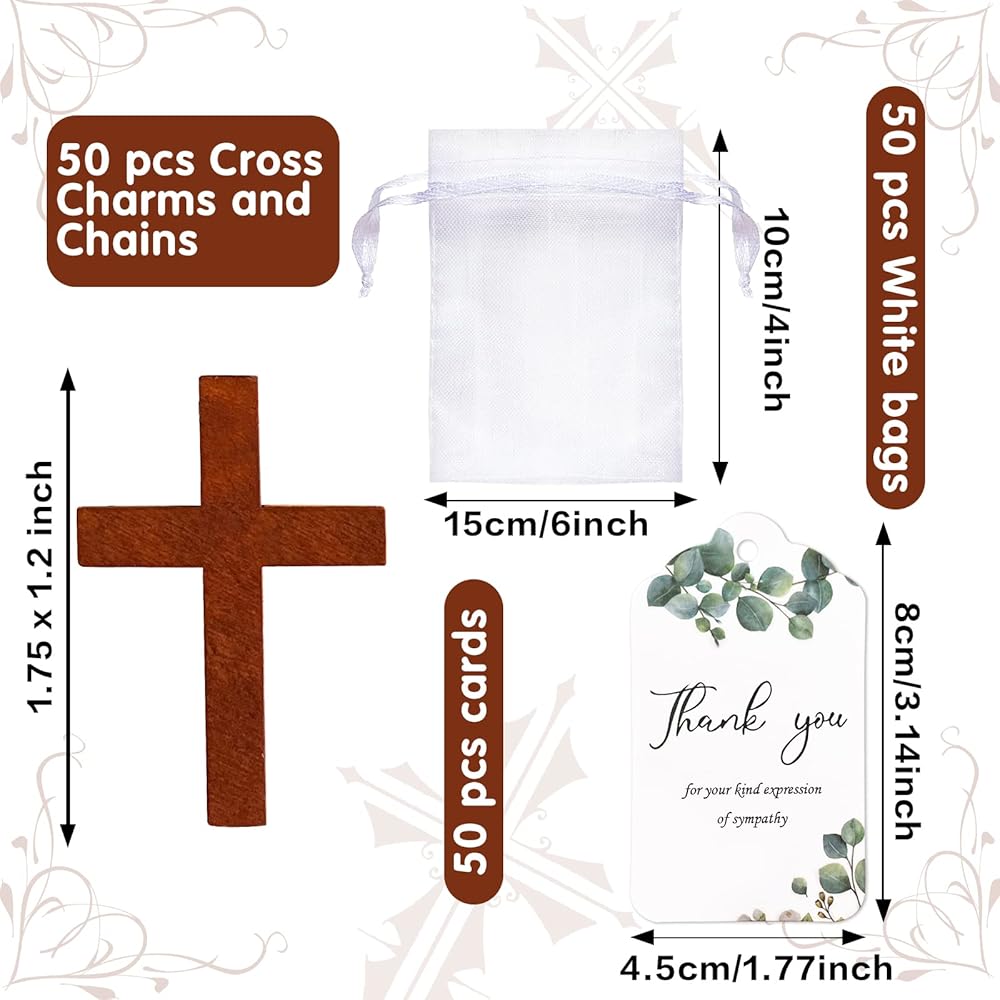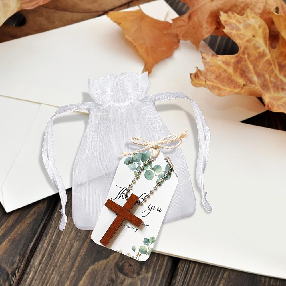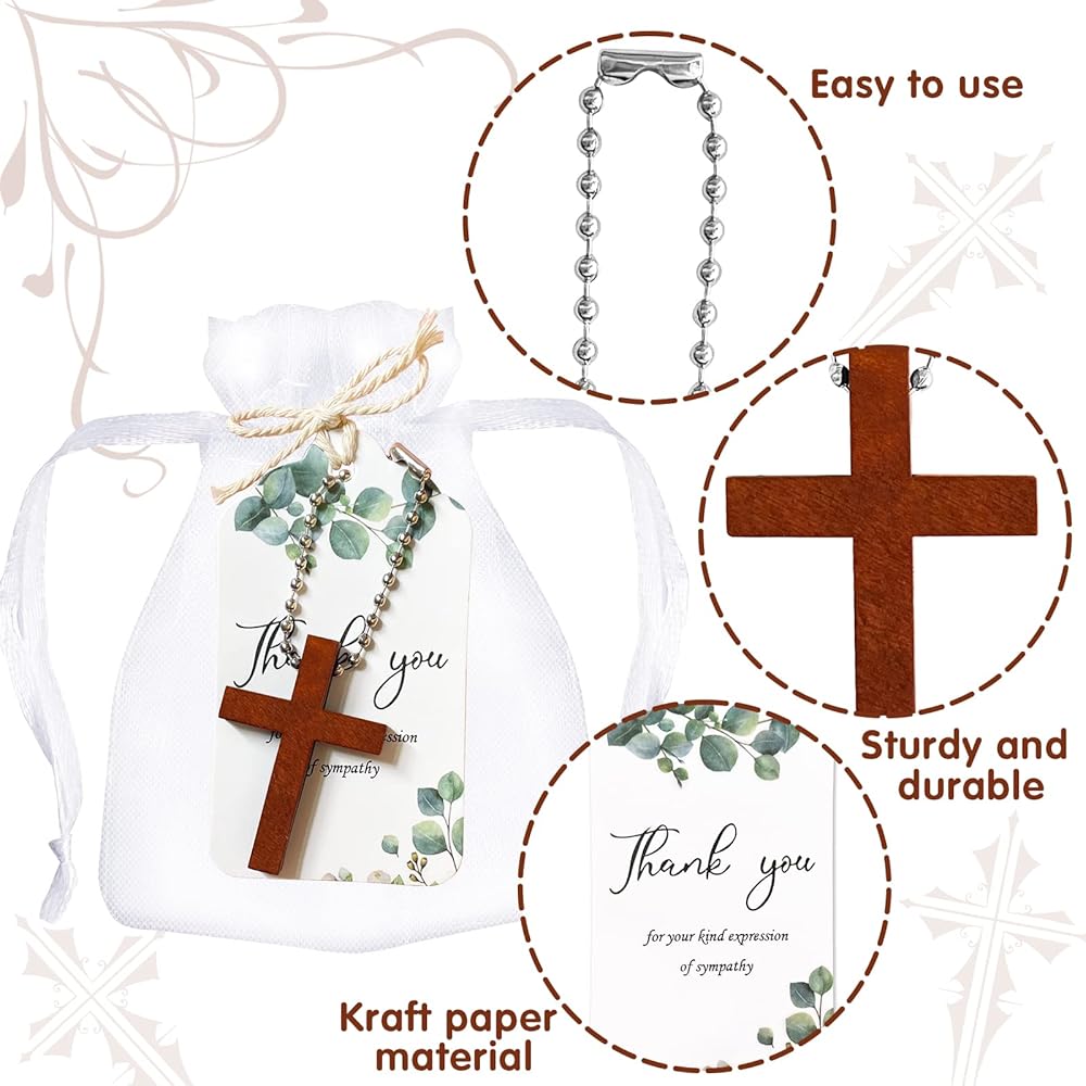 Package include: You need to assemble it yourself, you will get 50 pieces wood cross charm keychains, 50 pieces white organza bags, 50 pieces bead chains and 50 pieces sympathy thank you tags, enough for you to provide to family and friends, we also provide you with cords, they will be easy to hang pendants to meet your decorative needs