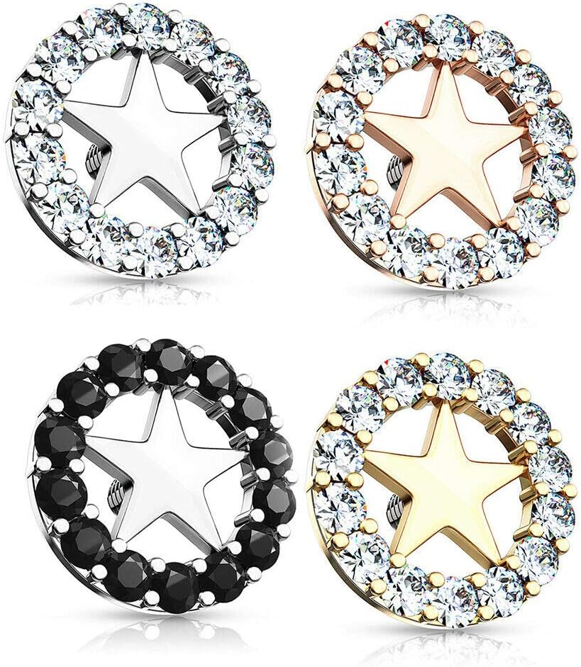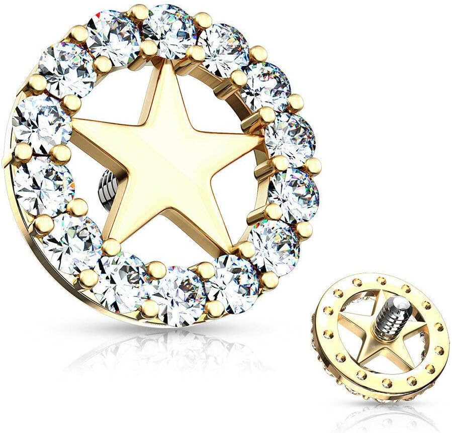 Make This your Next Favorite Dermal Anchor Top! Easy to Insert and Comfortable to Wear CZ Paved Circle Outlined Star Center Internal Threaded Dermal Anchor Tops. Made of High Quality 316L Stainless Steel and Brass with Rhodium Plating.