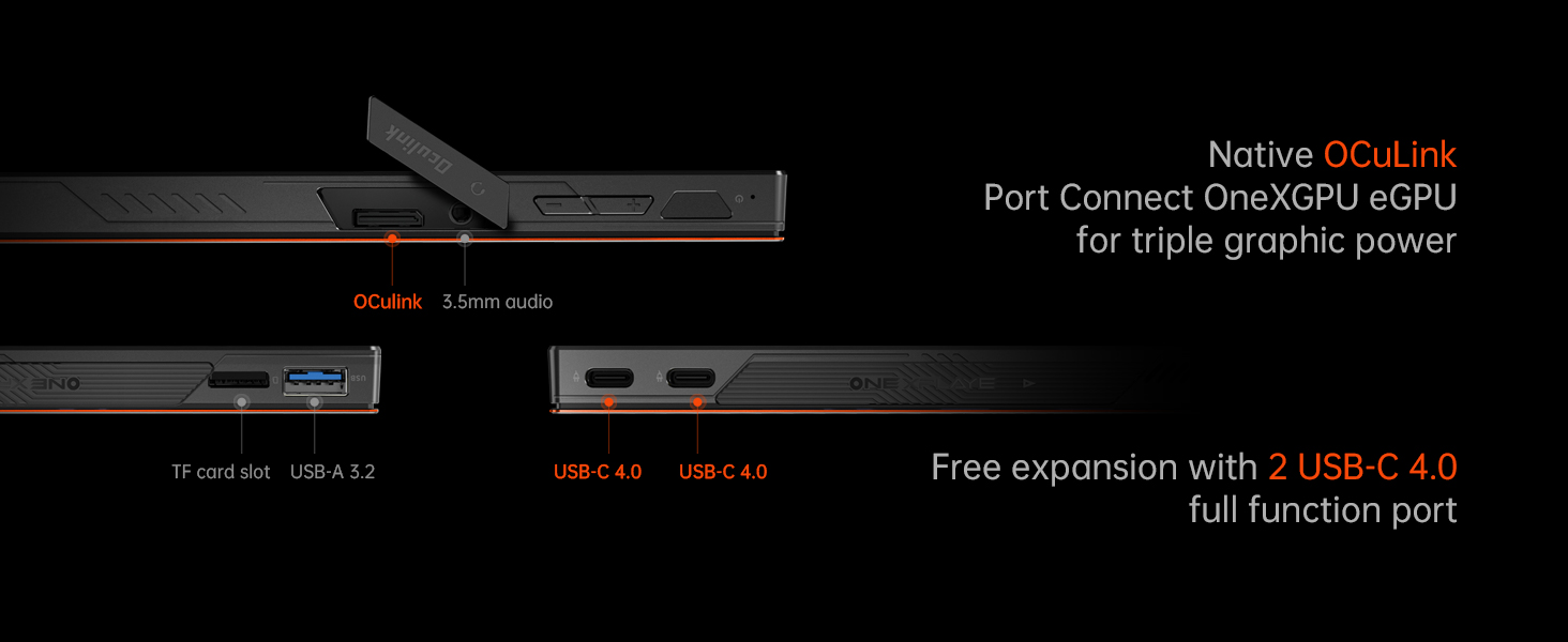 منفذ OCuLink الأصلي، قم بتوصيل OneXGPU eGPU للحصول على أداء فائق. يحتوي أيضًا على منفذي USB-C 4.0 كاملي الوظائف، ومنفذ USB-A 3.2، وفتحة Micro SD 4.0، ومقبس صوت 3.5 ملم للتوسعة المجانية.
