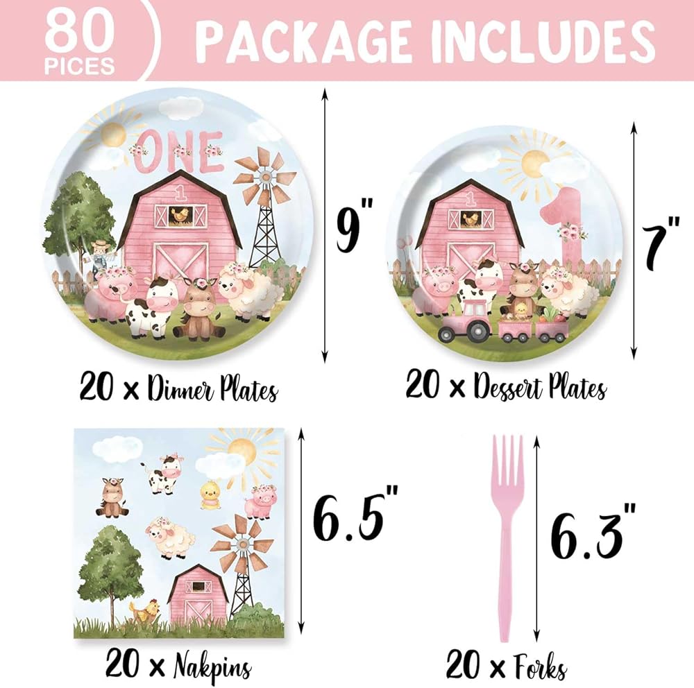 HEETON 80Pcs Pink Barn Farm Animals 1st Birthday Party Plates Cow One Farmhouse First Party Supplies Decorations for Girl Baby Bday