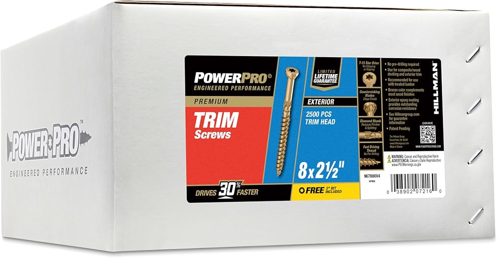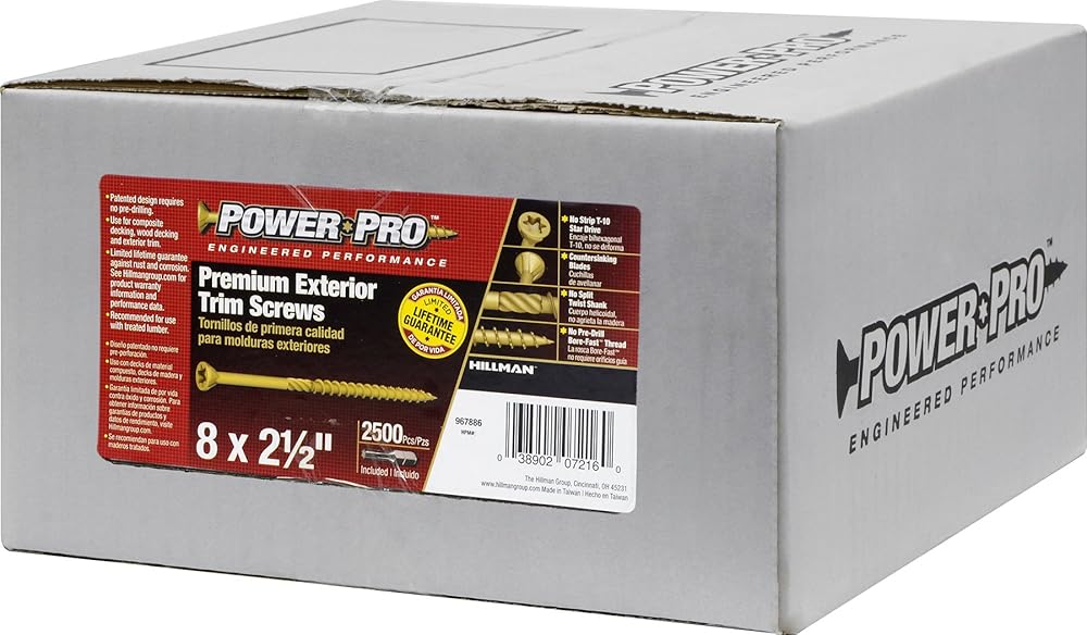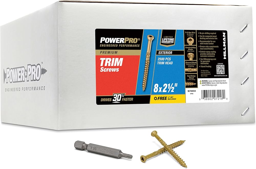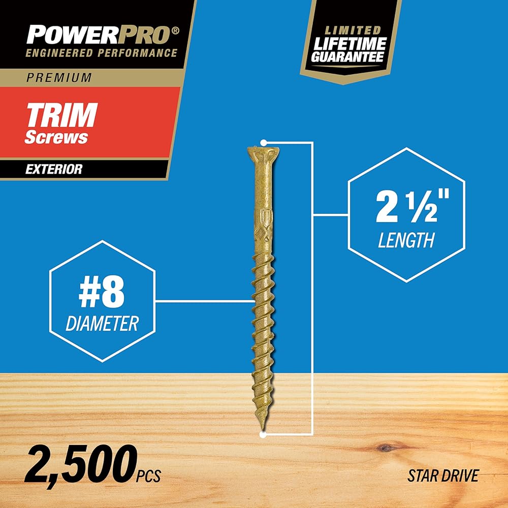 Power Pro Premium Exterior Trim Screws with star drive are ideal for composite decking, wood decking and exterior trim. The Star Drive technology featured on these screws virtually eliminates camout for a smooth, effortless drive every time. redwood, and treated wood for the life of the project. Parts are recommended for use with treated lumber.