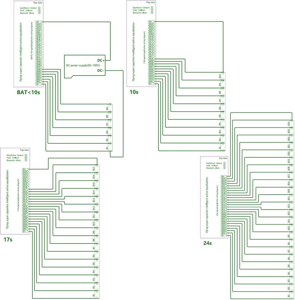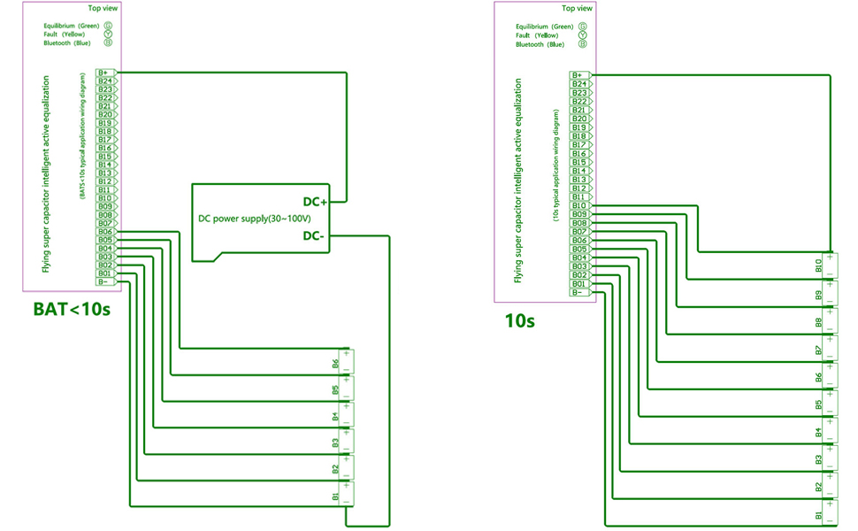 نوع البطارية المطبق: NCM/LFP/LTO (Li-ion/LiFePO4/LTO)؛ جهد العمل لخلية واحدة: 1.0~4.5V؛ رقم سلسلة البطارية المطبق: 10S-24S. ولكن (لا يوجد مصدر طاقة خارجي) الحد الأدنى للجهد الإجمالي لحزمة البطارية أكبر من 30 فولت، القيمة الموصى بها: بطارية ليثيوم أيون ≥ 10S، بطارية LiFePO4 ≥ 12S، بطارية LTO ≥20S؛ إذا كان الجهد الإجمالي لحزمة البطارية أقل من 30 فولت، فيجب توفير مصدر طاقة خارجي بتيار مستمر 30 فولت - 100 فولت (على سبيل المثال 4S-8S). إن الجمع بين لوحات التعادل المتعددة يدعم التتالي في لوحة التعادل لحزمة البطارية مع عدد أكبر من السلاسل.
