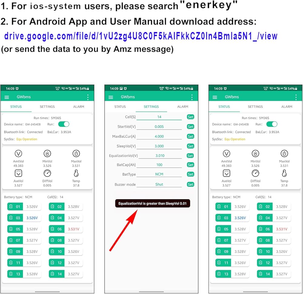 جهد النوم للحماية من الجهد المنخفض: يمكن تخصيص جهد النوم تحت الجهد الكهربي بواسطة التطبيق: 1.5-4.2 فولت؛ كشف السقوط: الدعم؛ تيار العمل الثابت: توازن 10 مللي أمبير، توازن 25 مللي أمبير؛ حجم اللوحة: 5.51 × 5.0 × 0.87 بوصة؛ طول سلك التوازن: 15.7 بوصة؛ اسم التطبيق: لنظام ios، يرجى البحث عن-GeeWEBMS، لنظام Android، يرجى الاطلاع على الصورة أو الاتصال بنا عن طريق الرسالة، يمكننا أن نرسل لك رابط التنزيل وطريقة الأسلاك ودليل اللغة الإنجليزية.
