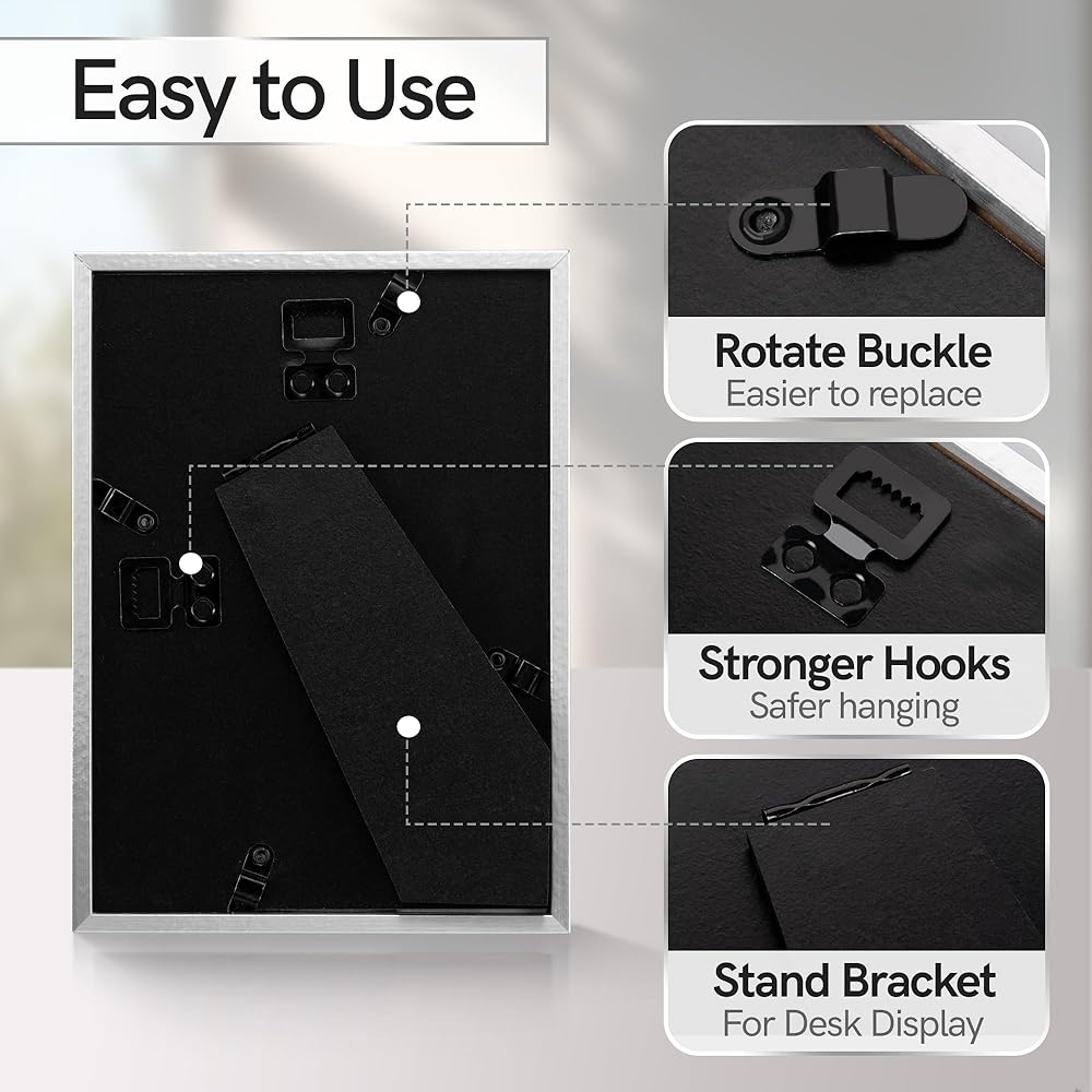 • سهل الاستخدام: يحتوي الإطار على خطافات ودعامات متينة وسهلة الاستخدام في الخلف، مما يجعل من السهل تغيير الصور واستخدام الإطار أفقيًا أو رأسيًا على الجدران وأسطح الطاولات.
