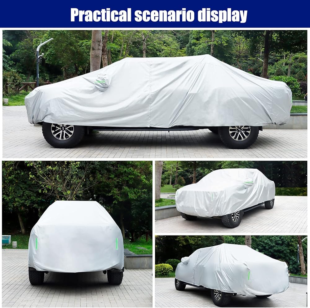 【تصميم مقاوم للرياح】تم تصميم غطاء الالتقاط Migaven خصيصًا لمقاومة الرياح القوية. ① تمت خياطة أربعة أشرطة في مواضع الإطارات الأربعة لمساعدتك على ربط غطاء السيارة بالعجلات الأربع لضمان عدم تحرك الغطاء. ② توجد أحزمة مقاومة للرياح مصممة خصيصًا في الجزء السفلي لتمريرها عبر منتصف السيارة لضمان عدم تفجير الغطاء. ③ الحافة المرنة القابلة للتعديل تجعل من السهل ضبط الحجم وتثبيت الغطاء على جسم السيارة.