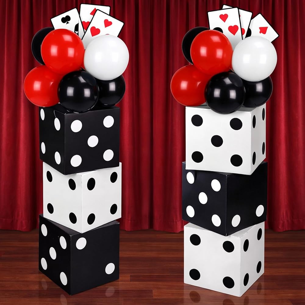 • Casino Themed Party Accessories: the package includes 6 dice favor boxes in 2 colors, each color for 3 pieces, 48 red black and white balloons, 6 jumbo poker cards, nice in combination, designed for game night, new year graduation, prom party or other celebration
