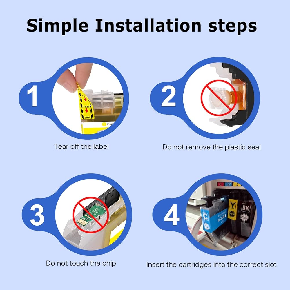 - العناصر المتضمنة: 1x LC203XL أسود، 1x LC203XL سماوي، 1x LC203XL أرجواني، 1x LC203XL أصفر، 1x دليل المستخدم