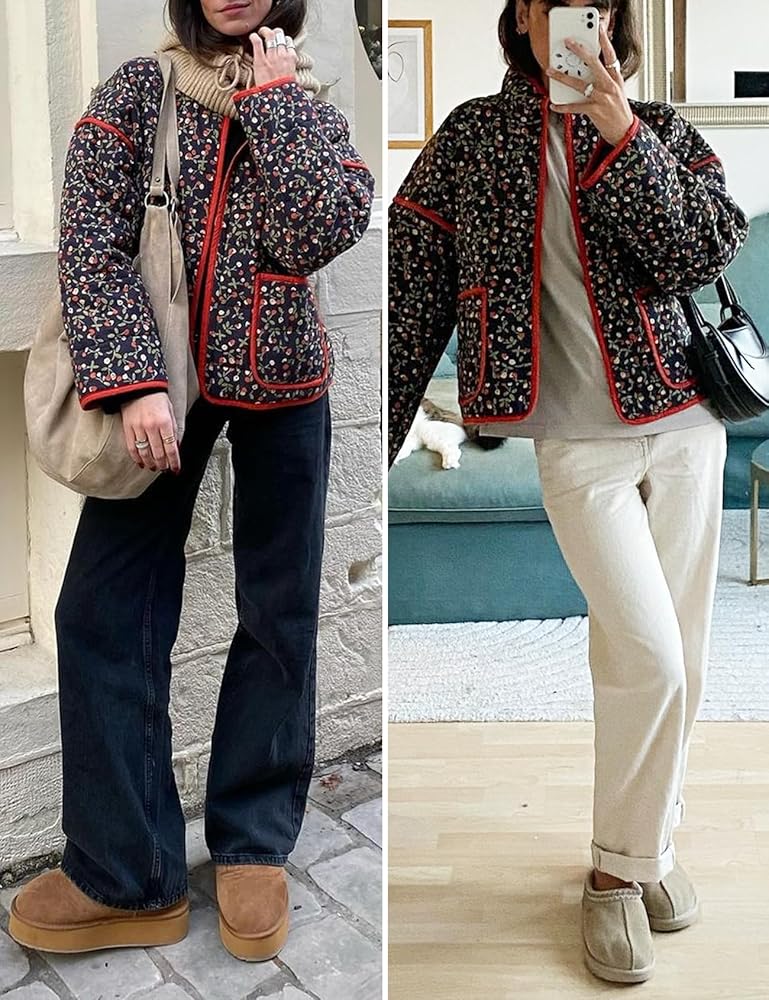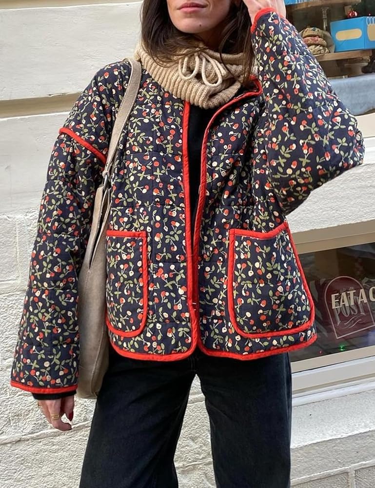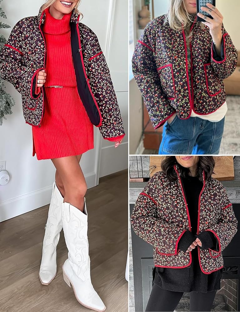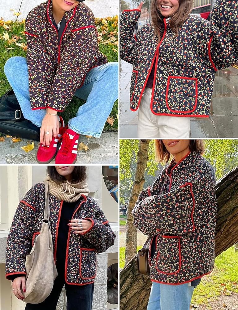 سترة نسائية منتفخة قصيرة خفيفة الوزن ومطبوعة بالورود وأكمام طويلة مبطنة ومبطنة منتفخة معطف كارديجان (أسود-S)