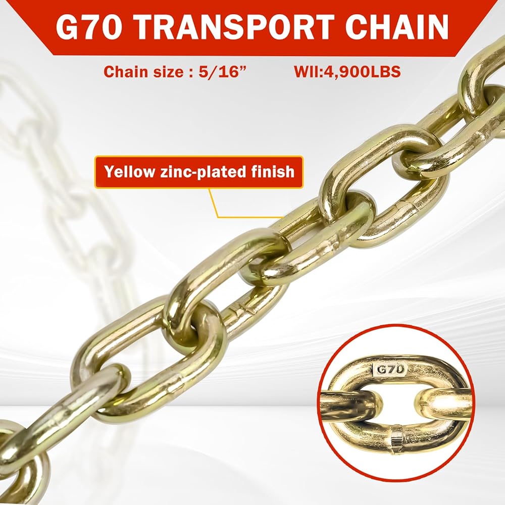 [سلسلة نقل موثوقة] - درجة السلسلة 80، قطر الوصلة: 5/16 بوصة. الطول الإجمالي: 35 بوصة. حمل عمل آمن يصل إلى 4,900 رطل. مما يوفر قوة شد ممتازة ومقاومة لارتداء البضائع الثقيلة.