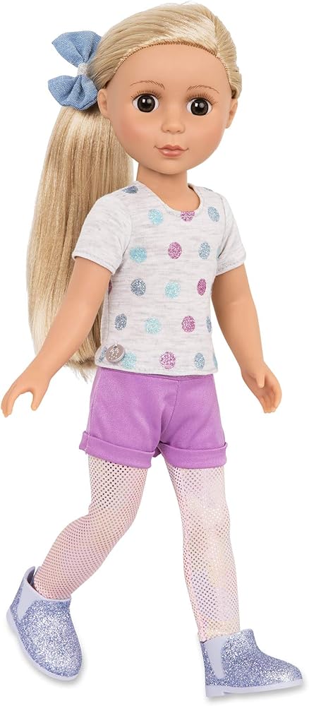 Includes: (1) 14-inch doll, (1) t-shirt (1) pair of shorts (1) pair of tights (1) pair of shoes (1) bow.