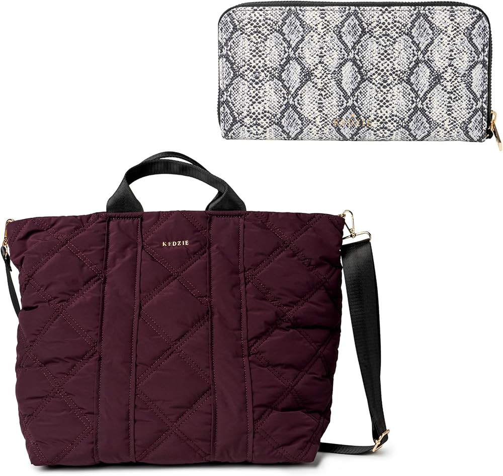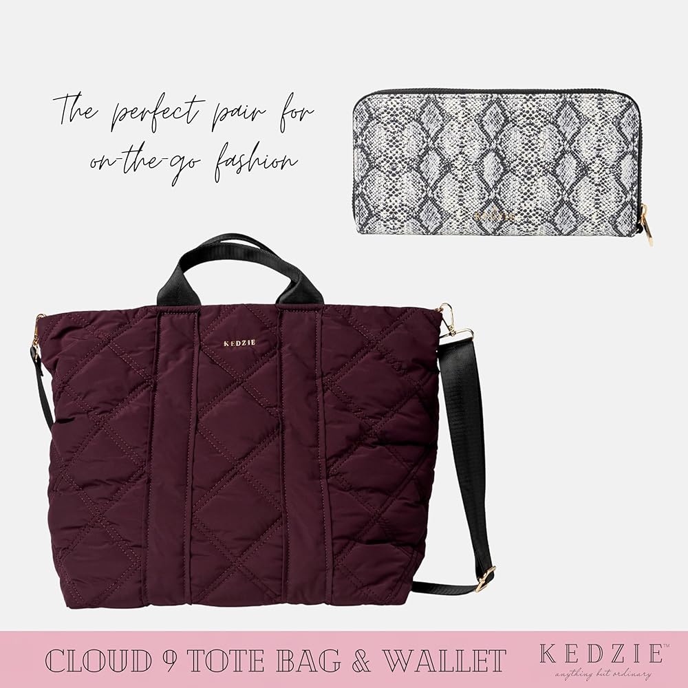 THIS BUNDLE CONTAINS Cloud 9 Quilted puffer tote bag (Mulberry) and Eclipse zip-around wallet (Pretty in Python). This bundle is perfect for anyone who wants to add a touch of style and functionality to their everyday life. Whether you're heading to work, running errands, or traveling, this bundle will be your go-to accessories.
