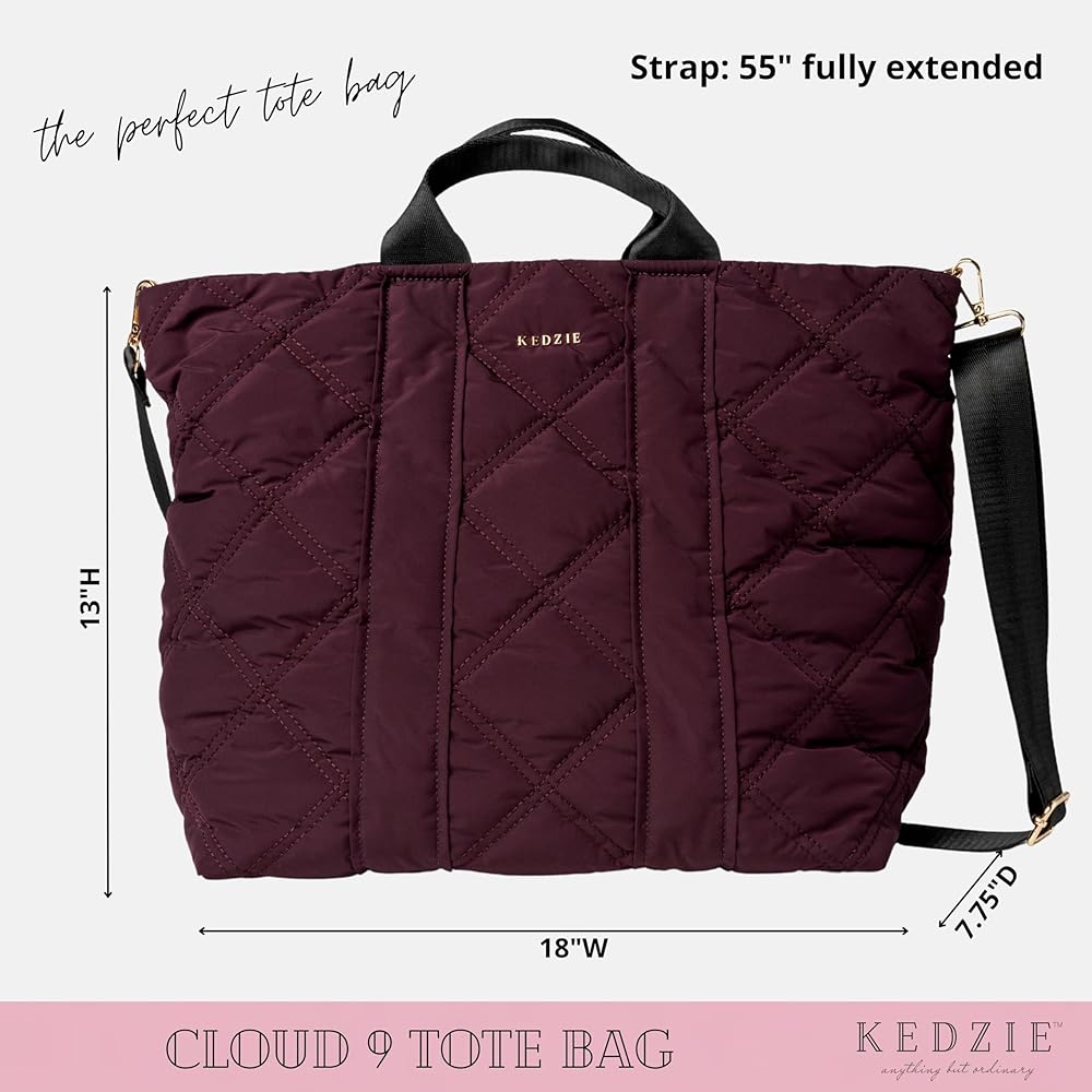 CLOUD 9 TOTE BAG: The quilted puffer tote bag is a stylish and functional accessory that is perfect for carrying your essentials. Made with high-quality materials, this bag features a quilted puffer design that is both trendy and durable. This tote bag features extra large main compartment, interior valuables pocket, reinforced double handles. Bag dimensions: 18” W x 13” H x 7.75” D. Strap: 55” fully extended.