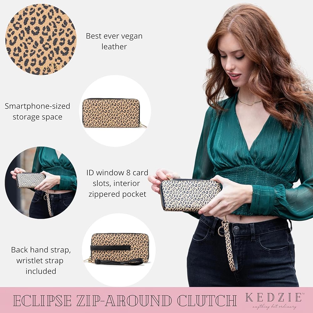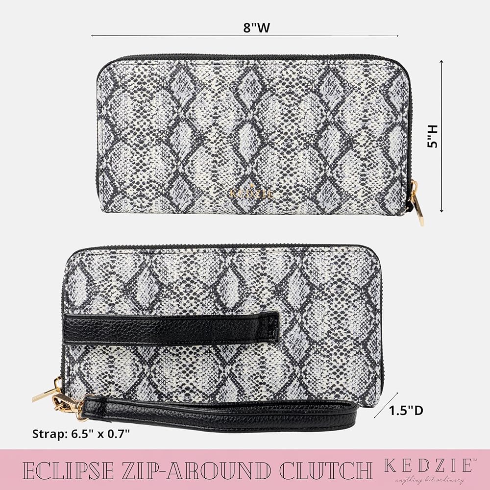 ECLIPSE ZIP-AROUND CLUTCH/WALLET: This clutch is made from high-quality vegan leather that looks and feels just like the real thing, but without any harm to animals. The interior features vegan leather, smartphone-sized storage space, ID window, eight card slots, interior zippered pocket, back hand strap, wristlet strap included. Wallet dimensions: 8” W x 5” H x 1.5” D. Strap: 6.5" x 0.7".