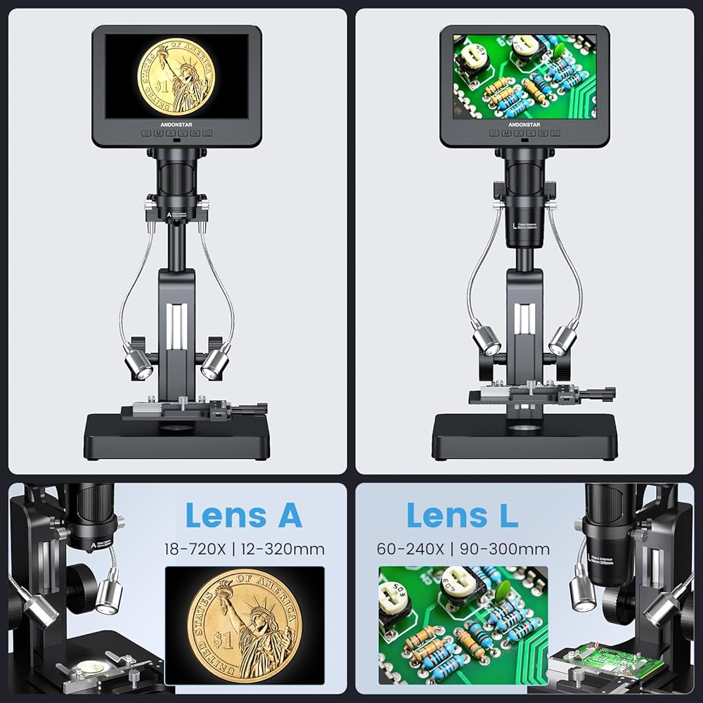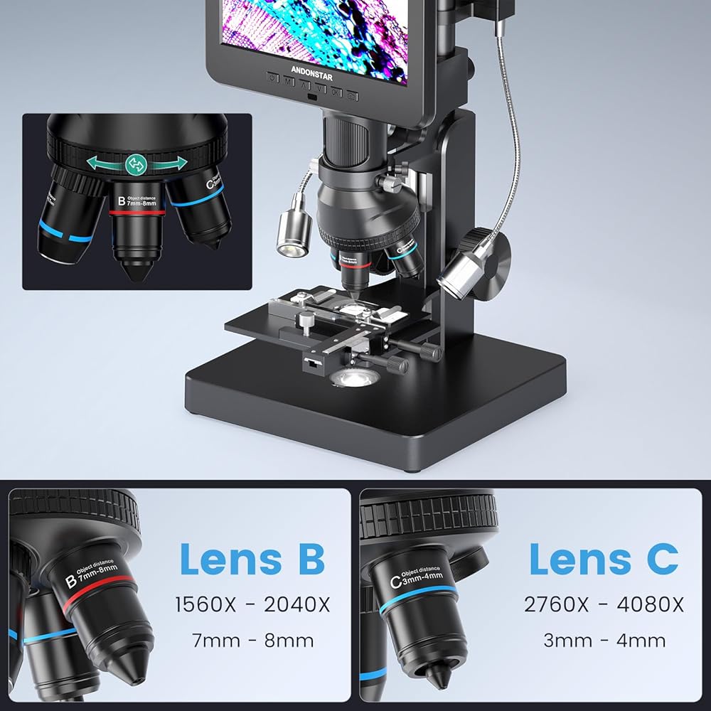 【مجهر رقمي Andonstar 2024 5 عدسات】عدسة A(18-720x) لمراقبة العملات المعدنية الكاملة أو الخطأ، والأحجار، والنباتات، وما إلى ذلك. العدسة B (1560-2040x)، العدسة C (2760-4080x)، العدسة M (3600-5100x) لشرائح المجهر البيولوجي للمختبر المنزلي، العدسة L (60-240x) لحام وإصلاح لوحة دوائر PCB/SMD، إلخ.