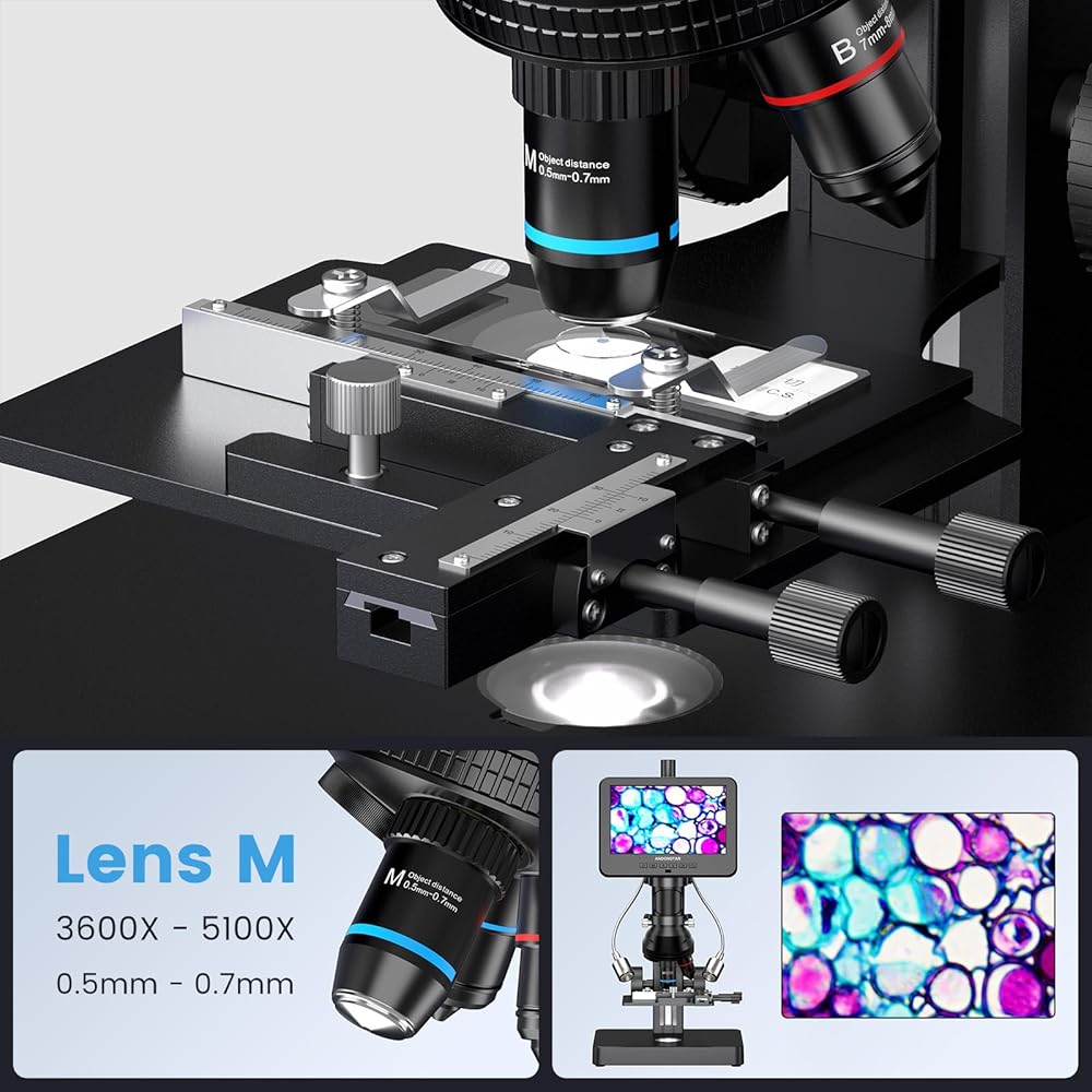 【مجهر بيولوجي 5000X للبالغين والأطفال】مع 3 عدسات تكبير كبيرة B وC وM، تتمتع العدسة M بأقصى تكبير 5000X (مع تكبير رقمي 3x). تتضمن المجموعة 5 شرائح بيولوجية مُجهزة، والتي ستوفر للأطفال تجربة أفضل بكثير لاستكشاف عالم المراقبة الصغير.