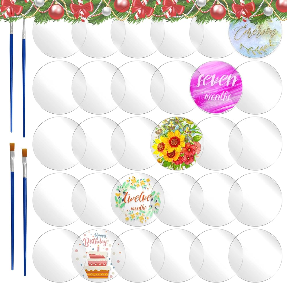 30 قطعة من دوائر الأكريليك الشفافة مقاس 4 بوصات من Daily Treasures مع 4 فرش طلاء، قرص بلاستيكي دائري - ورقة دائرة من الأكريليك الشفاف لإطار الصورة الفنية اللوحة DIY