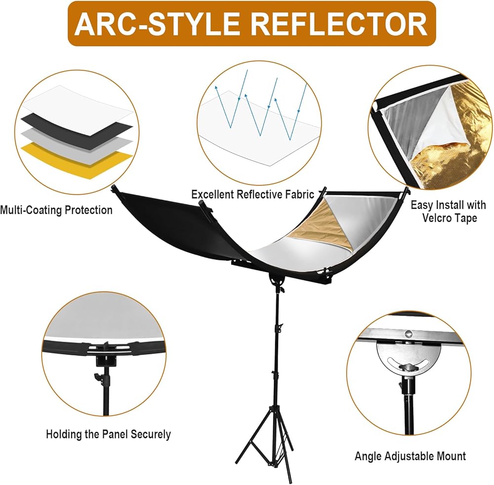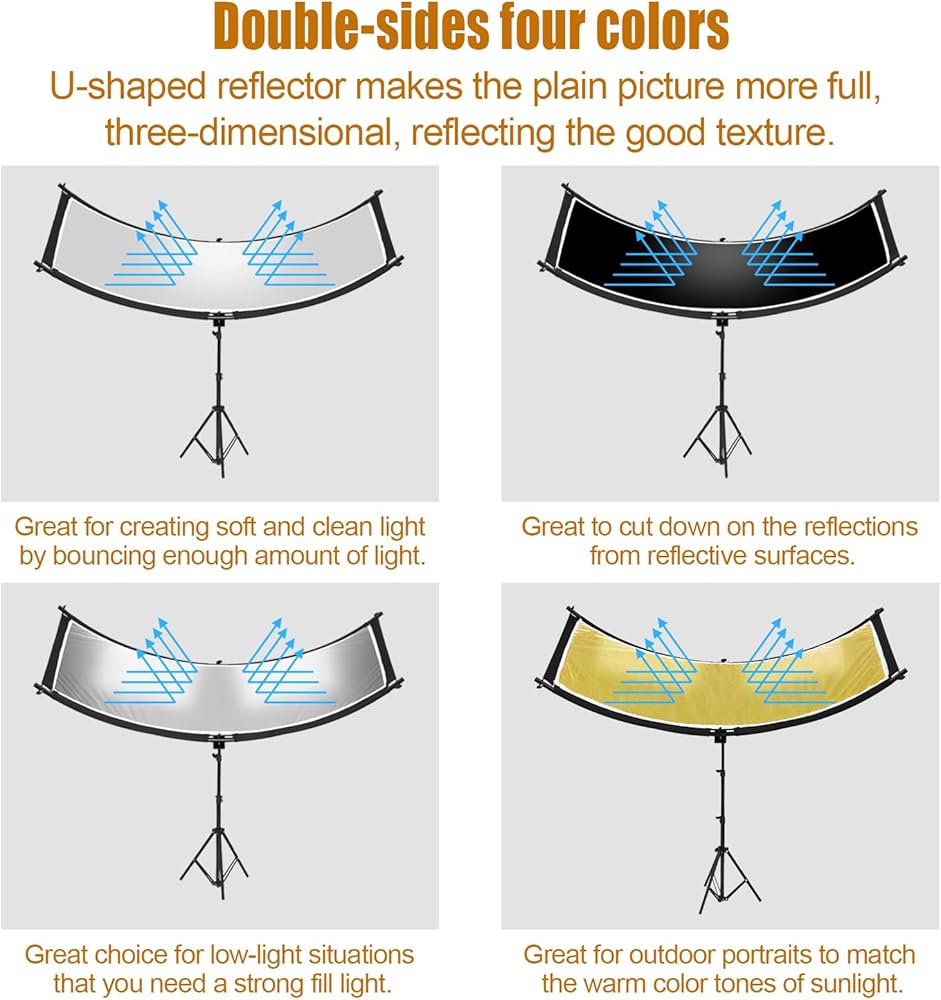 📷【𝑨𝒓𝒄-𝑺𝒉𝒂𝒑𝒆𝒅 𝒅𝒆𝒔𝒊𝒈𝒏】: This photography reflector with stand is arc-shaped (also known as U -shaped or curved) that can reflect light to better focus on the details you need to highlight the display; Double-Sides Reflector with 4 colors (gold, white, silver, black), offering you four distinct lighting options. The silver one that bounces light with high contrast while the black one can reduces excessive reflection. The double -sided cover (gold +white) can bring you more color effects, suitable for various photography occasions. The hook and loop fasteners makes the color-changing easily.