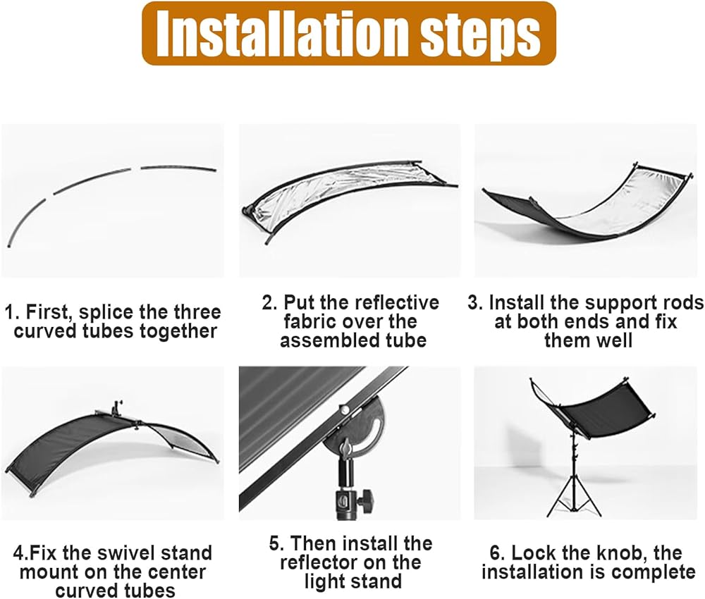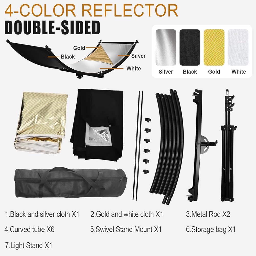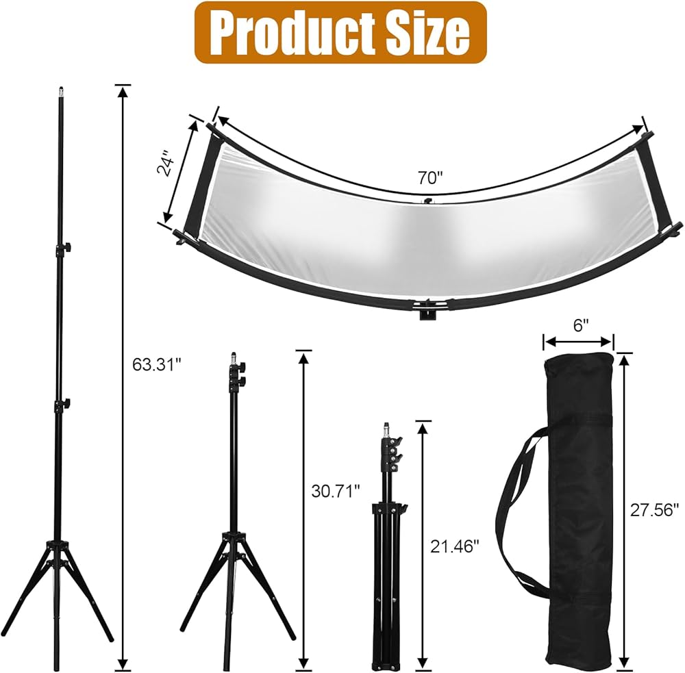 📷【𝑷𝒂𝒄𝒌𝒂𝒈𝒆 𝒄𝒐𝒏𝒕𝒆𝒏𝒕𝒔】: 1 x 70"x24" Clamshell Light Reflector (Four Colors:White, Gold, Silver, Black ); 1 x Light Stand; 1 x Carry Bag; 1 x Swivel Stand Mount; 6 x Curved Tube; 2 x Metal Rod. This curve reflector photography is Perfect for providing extra lighting for portraits and Head Shots, taking photos, making videos, making up,etc