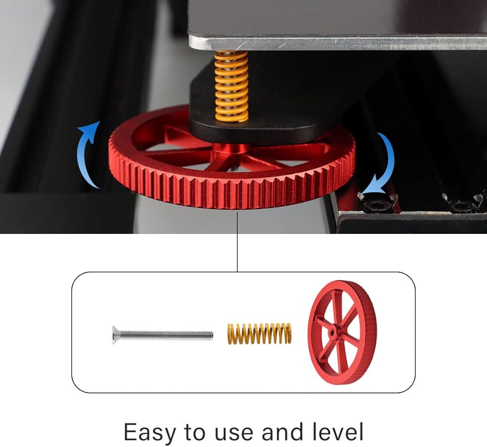 Upgraded aluminum hand twist level nuts make hot bed more stable and print platform leveling easier.