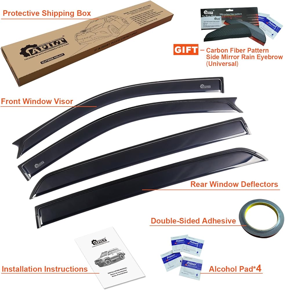 • تتضمن العبوة قطعتين من واقيات النافذة الأمامية وقطعتين من واقيات النافذة الخلفية، لا حاجة للحفر، سهلة التركيب بشريط لاصق، وآمنة لغسيل السيارة.