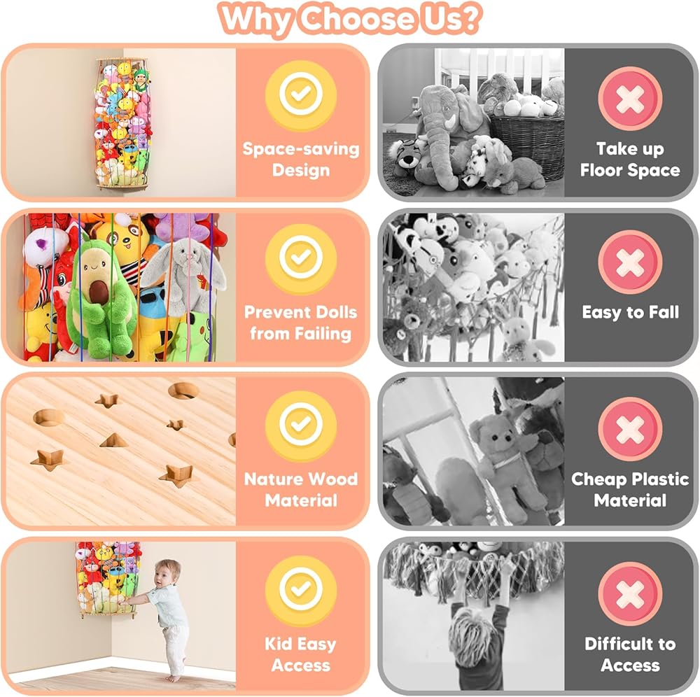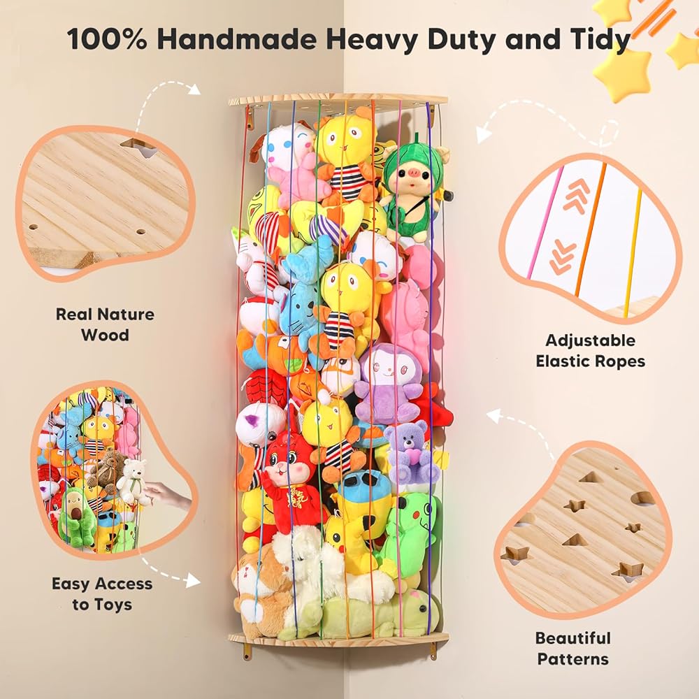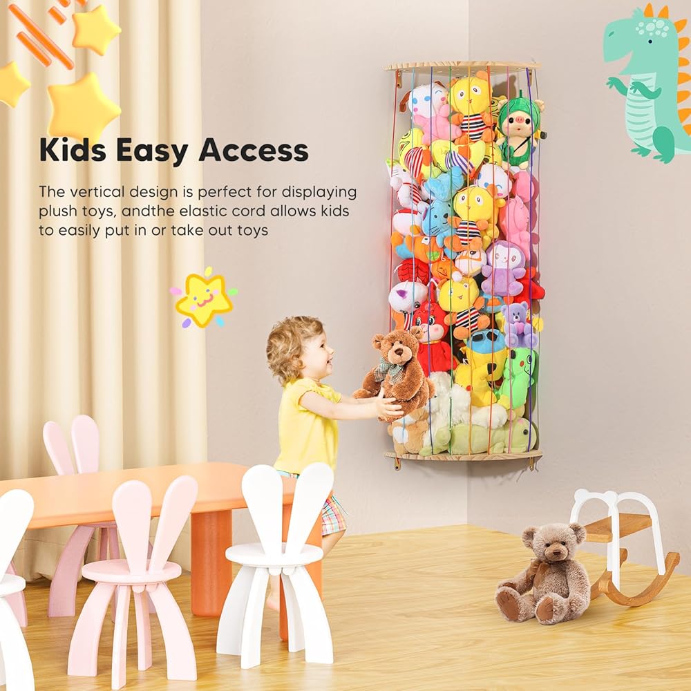 منظم ألعاب تخزين الحيوانات المحشوة، رف حائط للتخزين من القطيفة على شكل زاوية خشبية، حامل حيوانات محشوة بطول قابل للتعديل، تخزين ألعاب أطفال كبيرة لغرفة نوم الأطفال وغرفة اللعب