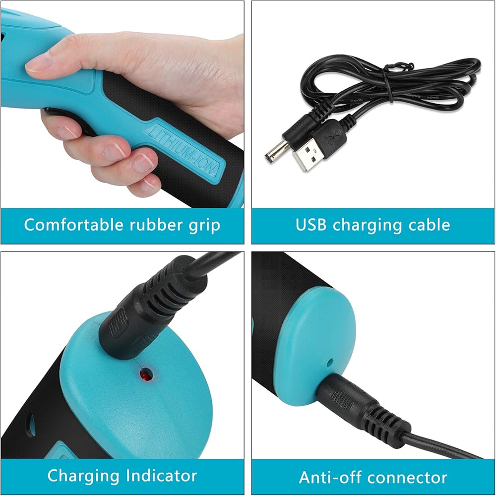 ✂ مقص قوي قابل لإعادة الشحن مع بطارية ليثيوم أيون ✂: يرجى شحن هذا القاطع اللاسلكي حتى نفاد الطاقة بدلاً من شحنه عند استلامه في المرة الأولى. يحتوي المقص الكهربائي اللاسلكي القوي لقطع الأقمشة على بطارية ليثيوم أيون قوية بقوة 4 فولت يمكنها أن توفر لك ما يصل إلى ساعتين من الطاقة المستمرة للحرف اليدوية والخياطة والأعمال الجلدية وما إلى ذلك. يمكن شحن مقصنا الكهربائي بالكامل خلال ساعتين باستخدام كابل USB ومحول مناسب.