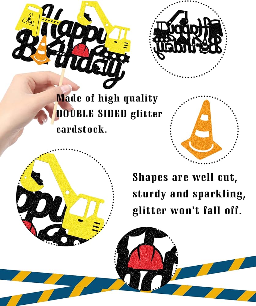 *Specification🏆Color: Black,Orange,Red,Yellow🏆Pattern Size: Approx. 6.1*4.3inch🏆Material: Double Sided Black Glitter Cardboard*Feature🏆1. Not only can use as cake topper, but also party&home decorations.🏆2. The product has been assembled, no assembly is required, and it can be used directly.🏆3. Decorate for Construction birthday party, make your birthday more wonderful.*Warm Tips🏆1. Please allow a little error on the size due to manual measurement.🏆2. Color might be slightly different due to the color calibration of each individual monitor.🏆3. Only for decoration purposes, this is not edible and please do not use it in oven or microwave.
