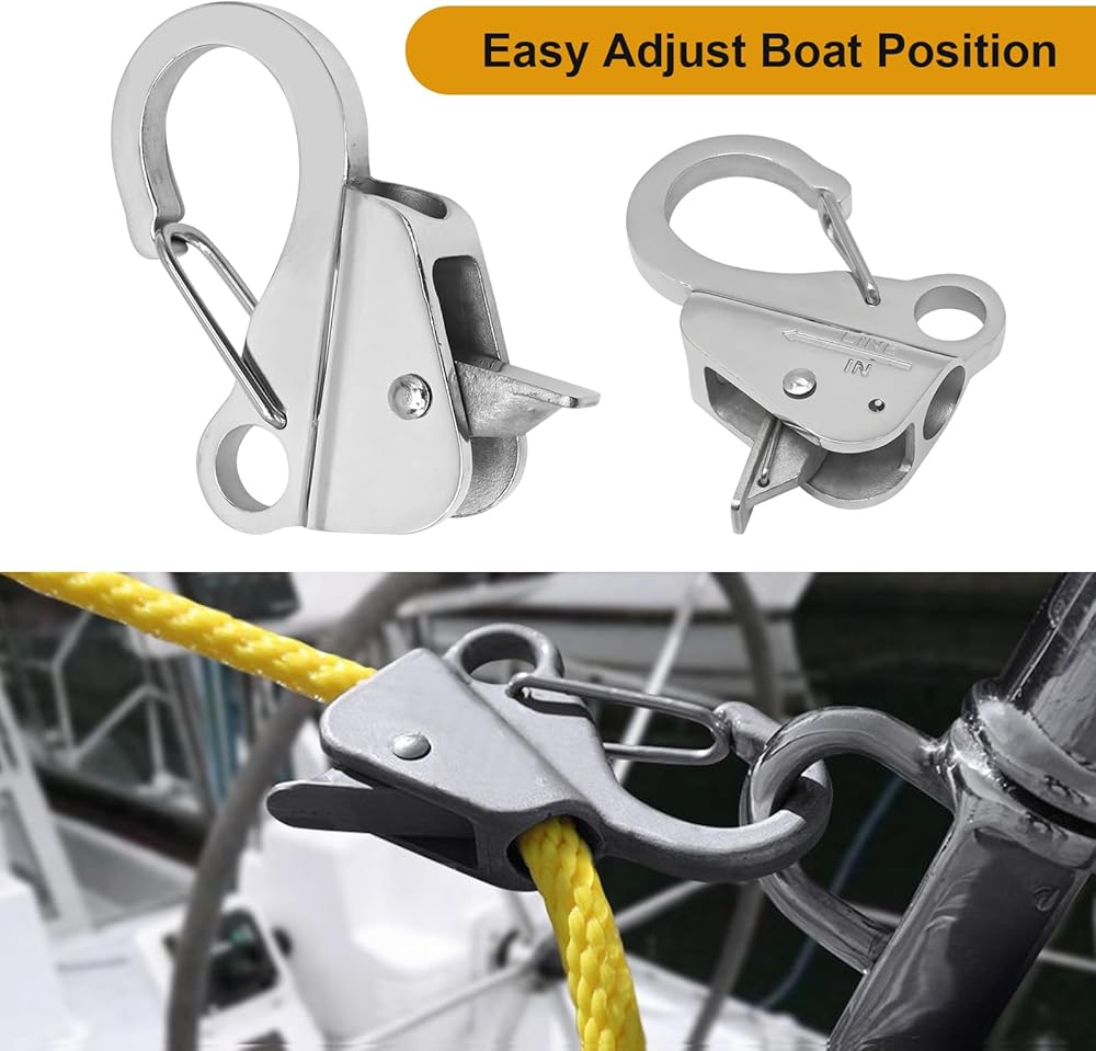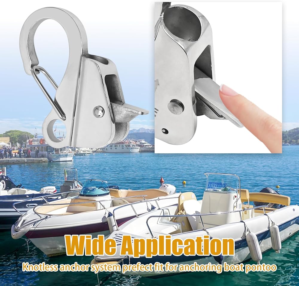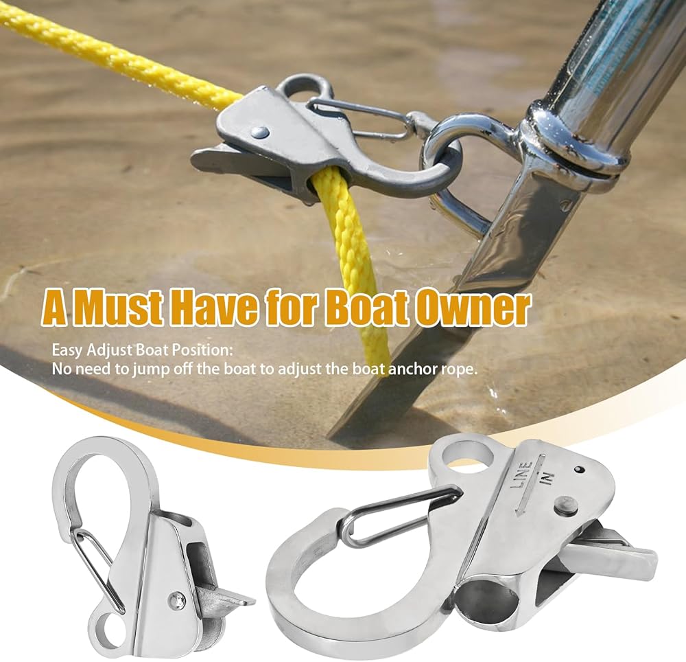 USAGE: Easy to connect: connect the dock rope to the stainless steel anchor rope hook and anchor; press and release the hook lever, the anchor rope can slide up and down freely, flexible positioning; the anchor line clip can clip the anchor rope at the desired position, flexible and adjustable