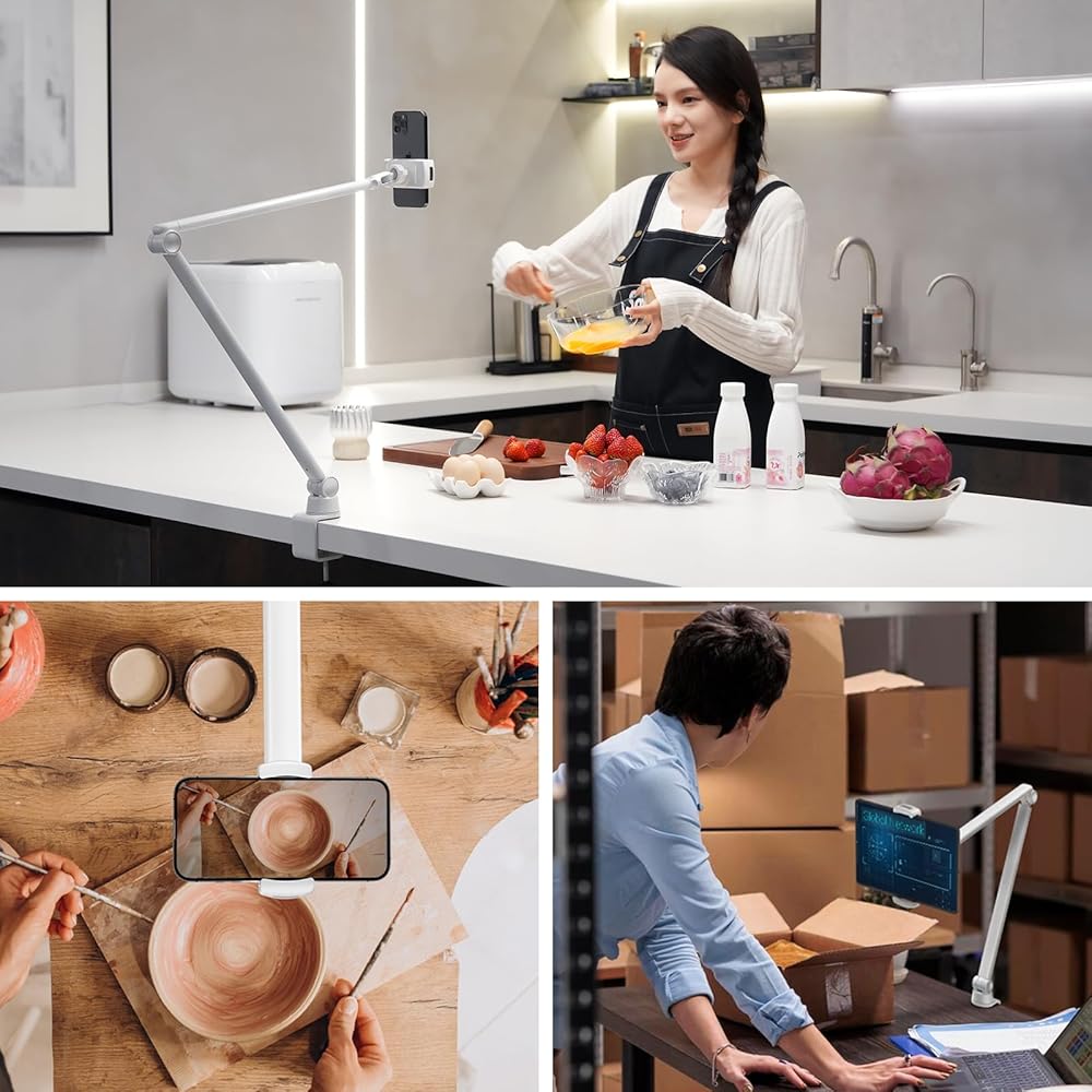 【صغير الحجم ومحمول】يقوم هذا الحامل متعدد الاستخدامات بوظائف متعددة، حيث يعمل كحامل هاتف للتصوير الفوتوغرافي فوق الرأس، وتسجيل محتوى فيديو الوسائط الاجتماعية، وتوفير الترفيه المريح على سريرك أو طاولة القهوة. بالإضافة إلى ذلك، يمكنه حمل شاشة ثانية بجانب شاشتك لأغراض العمل أو البث المباشر. يتيح لك تصميمها القابل للطي حملها بسهولة في جميع أنحاء منزلك، من المطبخ إلى الحديقة وغرفة العمل، مما يجعلها مناسبة للأنشطة مثل الرياضة وجلسات الجيم وصالونات الأظافر والسفر ورحلات العمل والمزيد.