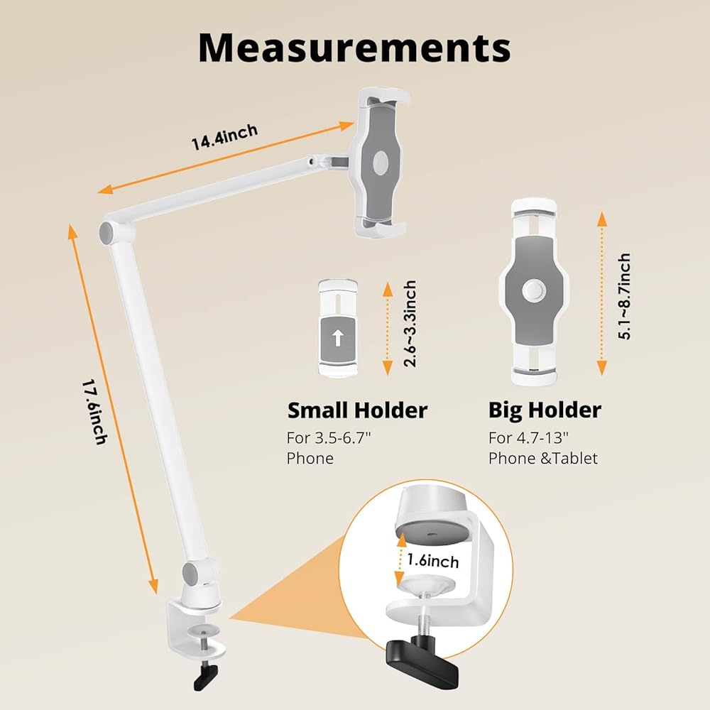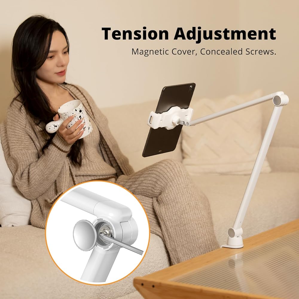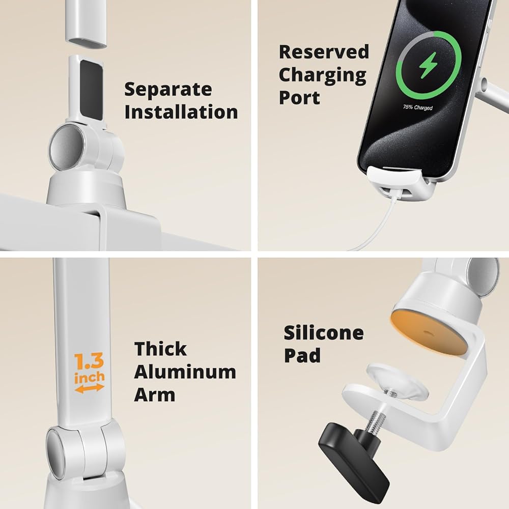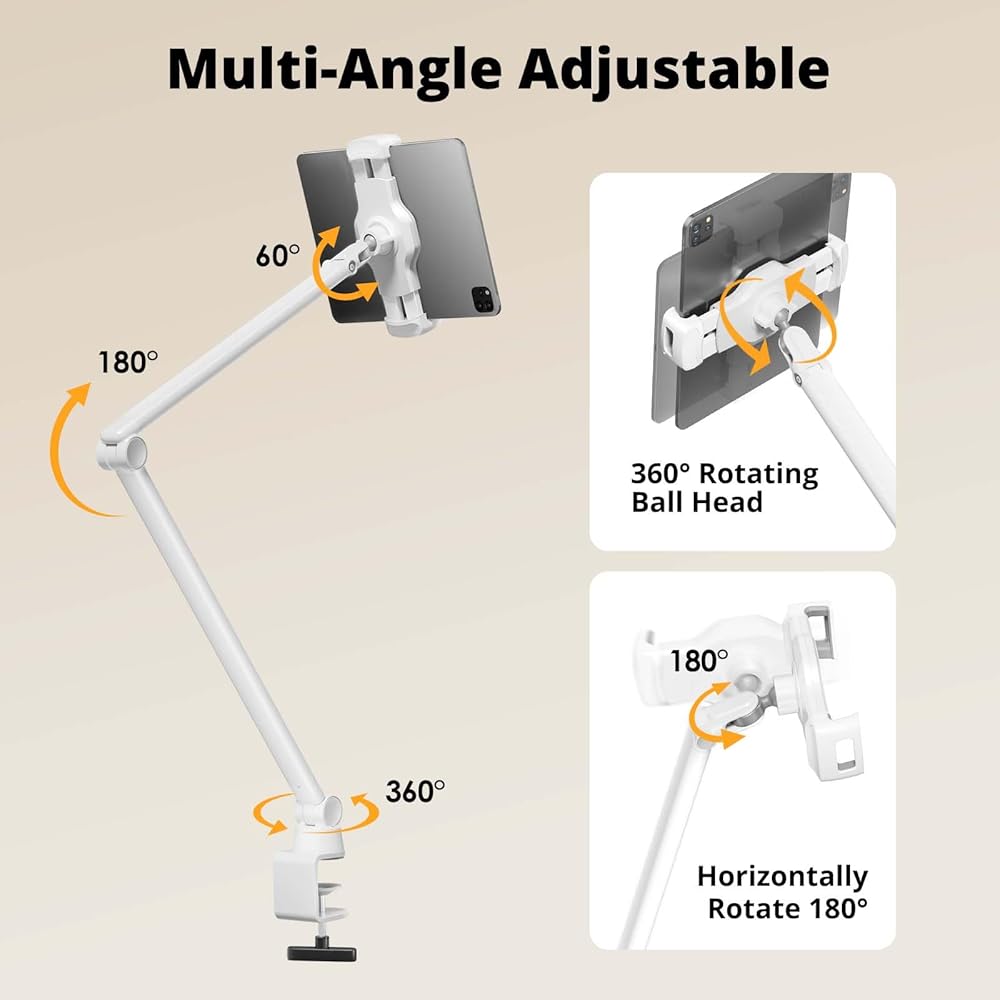 【بناء قوي】يلبي حامل الكمبيوتر اللوحي القابل للتعديل هذا جميع متطلباتك لذراع الهاتف والكمبيوتر اللوحي. مصنوع من سبائك الألومنيوم المصنعة بدقة مع لمسة نهائية بيضاء غير لامعة، ويتكامل تصميمه البسيط بسلاسة مع ديكور غرفتك. يمنع نمط المشبك الفوضى المكتبية، مما يسمح بوضعه على الجزء الخلفي من السرير، وخزائن المطبخ، وحواف الأرفف المختلفة في مكان العمل أو غرفة الدراسة. يكسر هذا التصميم المبتكر قيود حاملات سطح المكتب التقليدية، مما يوفر حلاً ثابتًا ومتينًا وموفرًا للمساحة.