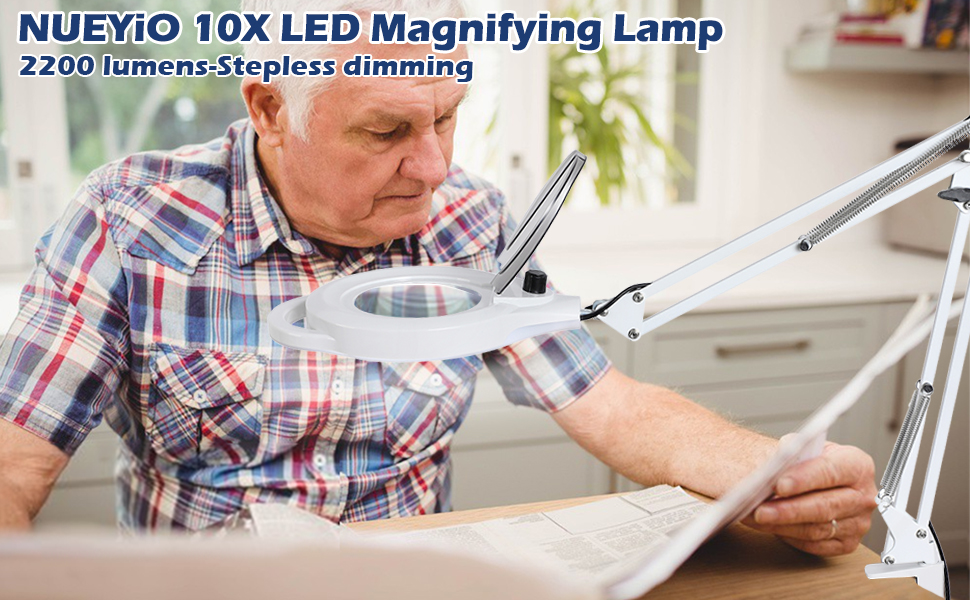 عدسة مكبرة للمكتب 10X مع ضوء ومشبك، NUEYiO 2,200 Lumen فائقة السطوع ستبليس خافت LED عدسة مكبرة، عدسة زجاجية حقيقية 8 ديوبتر، مصباح مكبر بذراع قابل للتعديل لإصلاح الأعمال اليدوية - أبيض in Kuwait