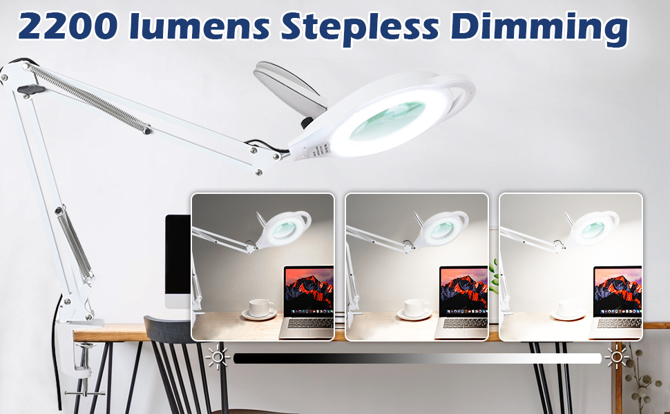 • 【2,200 لومن وخافت للرأس بدون خطوات】يتميز ضوء طاولة العمل بـ 120 قطعة من خرزات LED التي تجعل العدسة المكبرة للمكتب مع الضوء تتمتع بسطوع عالٍ يبلغ 2,200 لومن. أداة التعتيم الدوارة الموجودة على رأس المصباح تجعل تغيير الضوء أكثر سهولة ويمكنك ضبط السطوع بين 10% و100%.