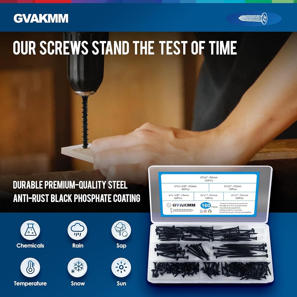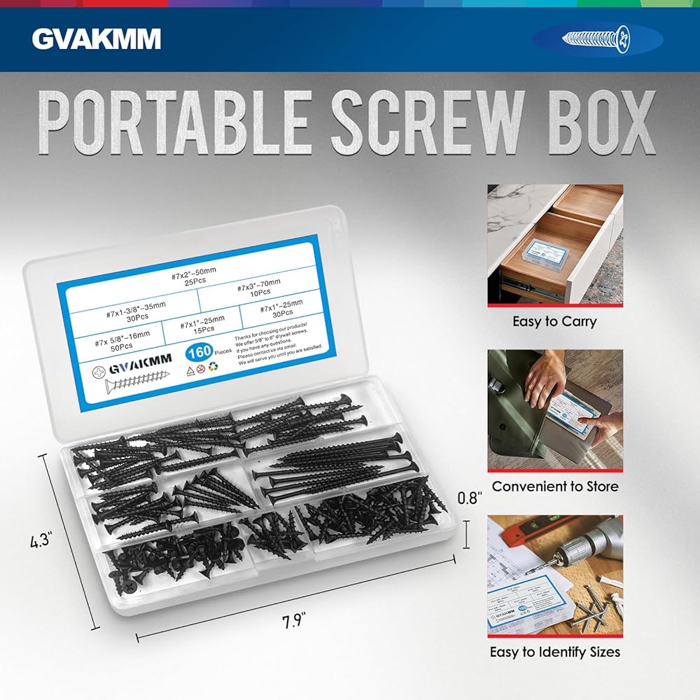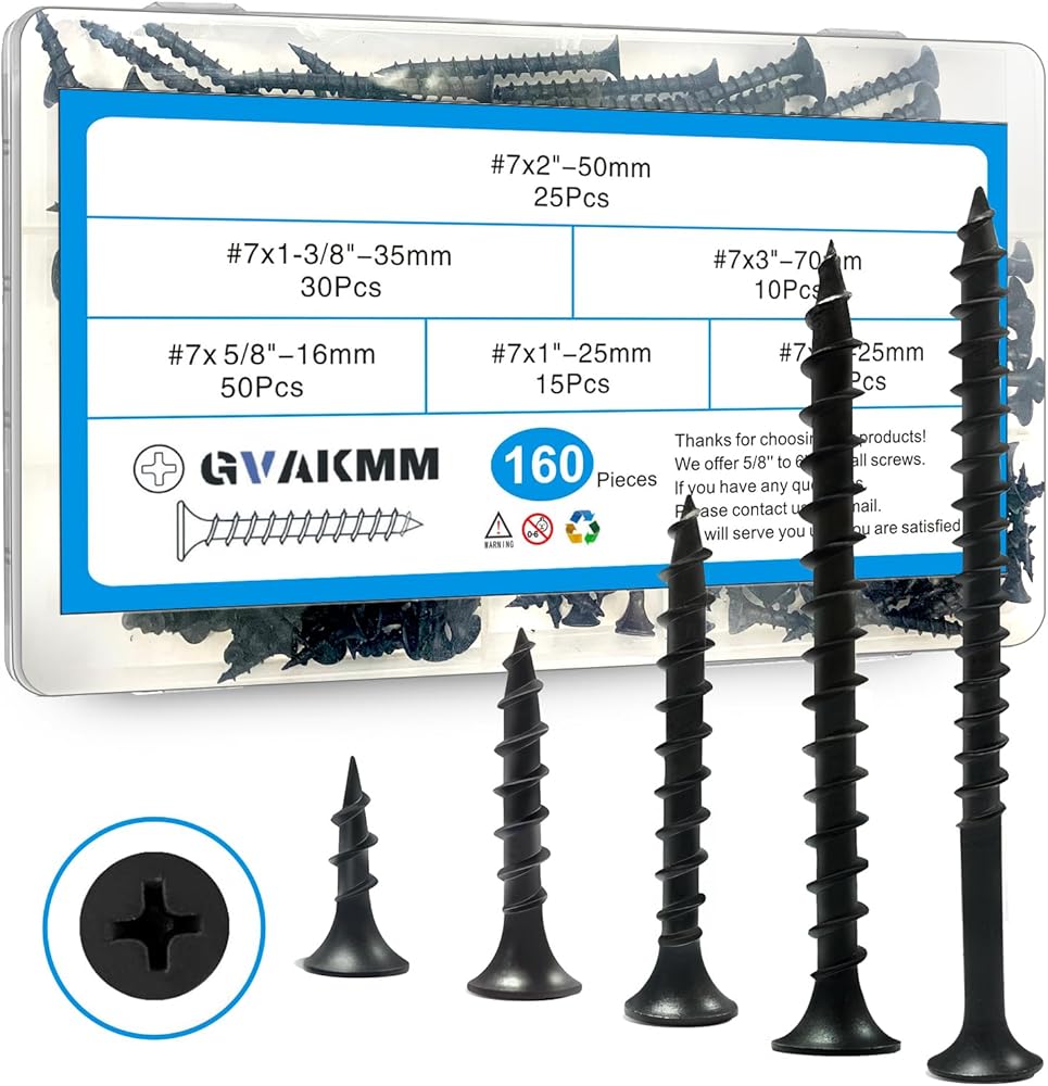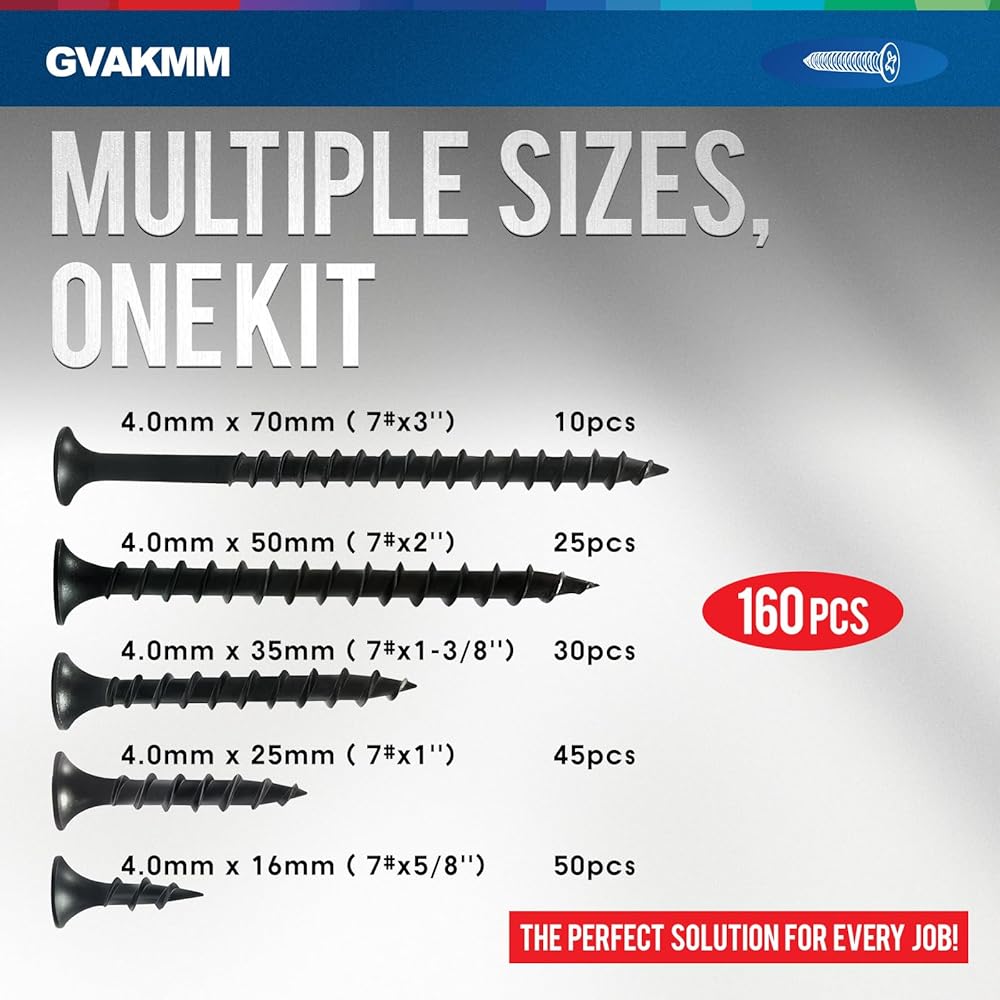 مجموعة متنوعة من براغي الحوائط الجافة، #7 مجموعة براغي خشبية سوداء، 160 قطعة، 5 أحجام (3 بوصة، 2 بوصة، 1-3/8 بوصة، 1 بوصة، 5/8 بوصة)، رأس بوق محرك فيليبس الخشن نقطة حادة، مثالية للخشب والألواح الصخرية والمزيد