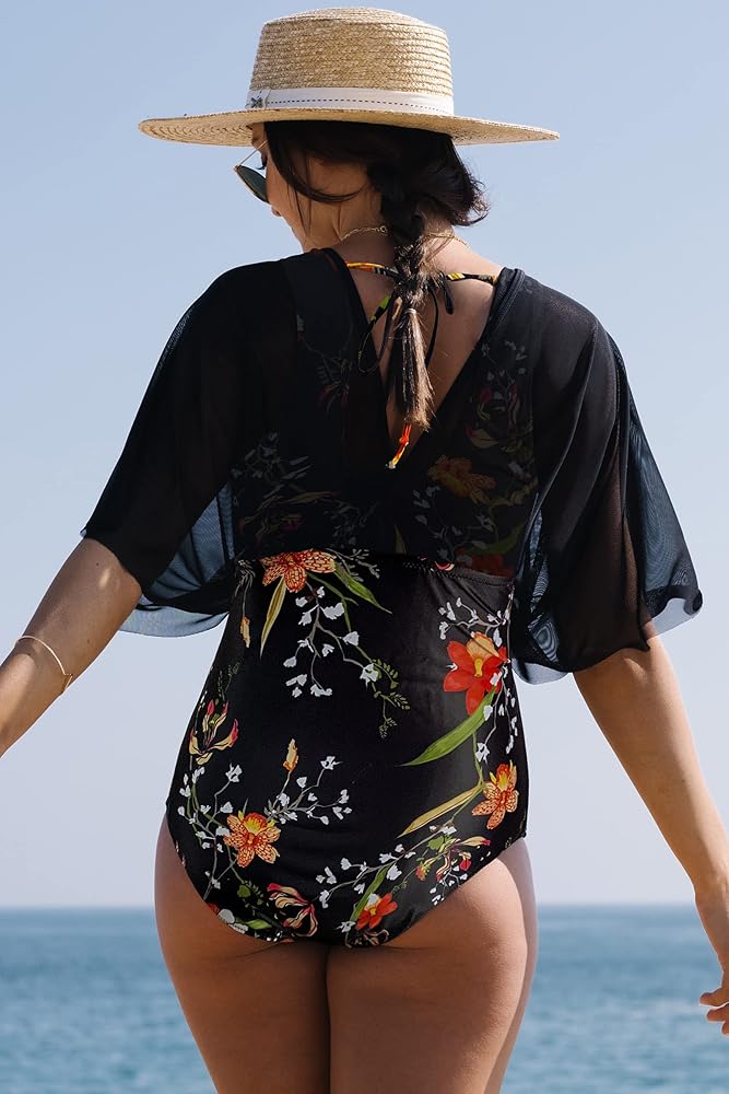 ملابس سباحة قطعة واحدة برقبة على شكل حرف V، مرقع بشبكة، أنيقة!