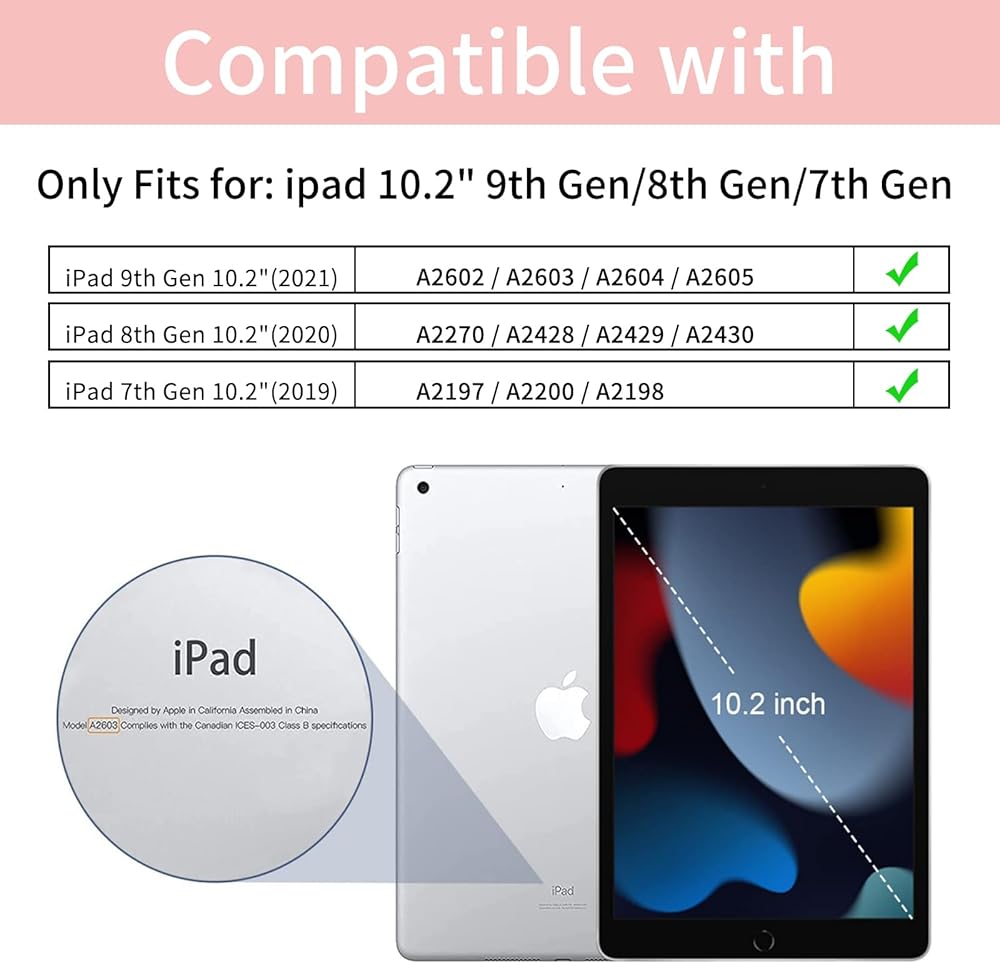 This slim case is compatible with iPad 9th Generation 2021 & 8th Generation 2020 & 7th Generation 2019. Fits models A2602, A2603, A2604, A2605, A2270, A2428, A2429, A2430, A2197, A2198, A2200. NOT compatible with any other models.