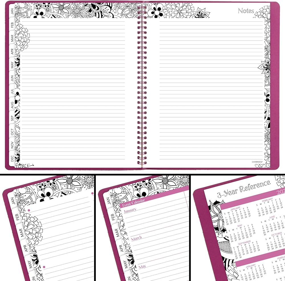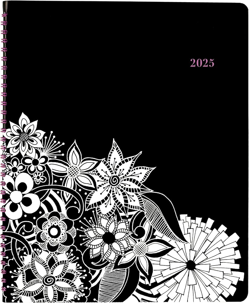Keep track of important deadlines, special events, reminders and more in style. The Cambridge FloraDoodle Weekly Monthly Appointment Book Planner covers 12 months from January 2025 – December 2025. This unique design features white flowers with a hand-drawn look on a black backdrop, and a pop of fuchsia on the interior covers. The same pattern borders each weekly and monthly planning spread. Weekly two page spread has ruled columns with hourly appointment times from 7:00 a.m. – 8:00 p.m. Monday – Friday Weekends are untimed. Pages measure 8-1/2" x 11". One month per two page spread has ruled daily blocks, blank doodles space and past/future month reference calendars. Each month is tabbed for quick date checking. Special pages include a 3-year reference calendar, event calendar, future planning, contacts and notes. Double-sided poly pocket stores loose sheets.