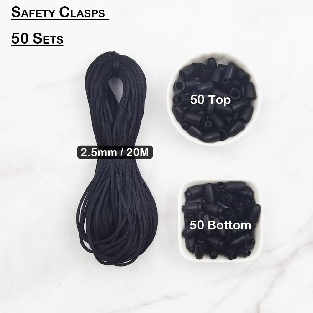 INSPIRELLE 50 مجموعة من المشابك البلاستيكية السوداء، مشابك أمان قابلة للفصل مع سلك ساتان 20 متر لصنع المجوهرات وقلادة وسوار