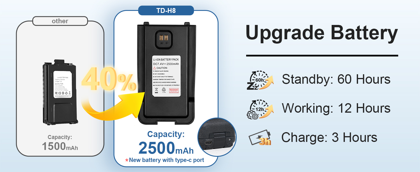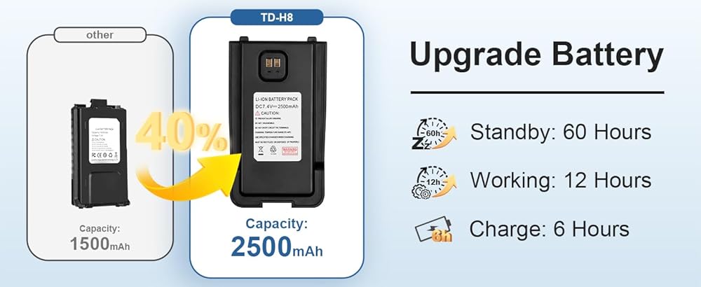 💎【بطارية كبيرة قابلة لإعادة الشحن بقدرة 2500 مللي أمبير في الساعة】 - وقت استعداد يصل إلى 60 ساعة. بالمقارنة مع راديو GMRS/Ham التقليدي الذي تبلغ سعته 1800 مللي أمبير في الساعة، تمت زيادة سعة بطارية H8 إلى 2500 مللي أمبير في الساعة، وهو ما يمثل زيادة في السعة بنسبة 40%، وزمن الانتظار أكثر من يومين. تضمن البطارية المتينة الاتصال دون انقطاع للتخييم أو صيد الأسماك أو المشي لمسافات طويلة أو محطات القطار وما إلى ذلك. أجهزة راديو H8 GMRS طويلة المدى بقدرة 5 وات، ومسافة اتصال تصل إلى 5-10 كم