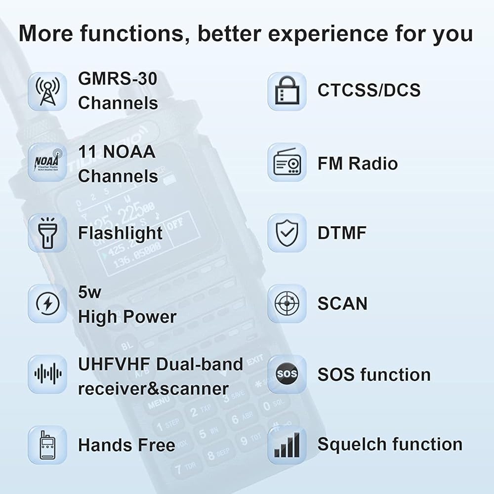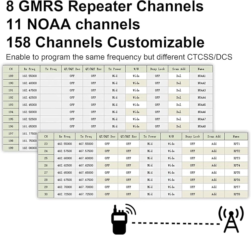 💎【راديو محمول GMRS متكامل متعدد الوظائف】 - قابل للبرمجة اللاسلكية، قائمة مكرر GMRS، SYNC، راديو FM، راديو NOAA، مهلة الإرسال، قفل قناة مشغولة، POC، 199 بنك قناة، ساعة مزدوجة، سحق قابل للتعديل، مسح ضوئي والمزيد