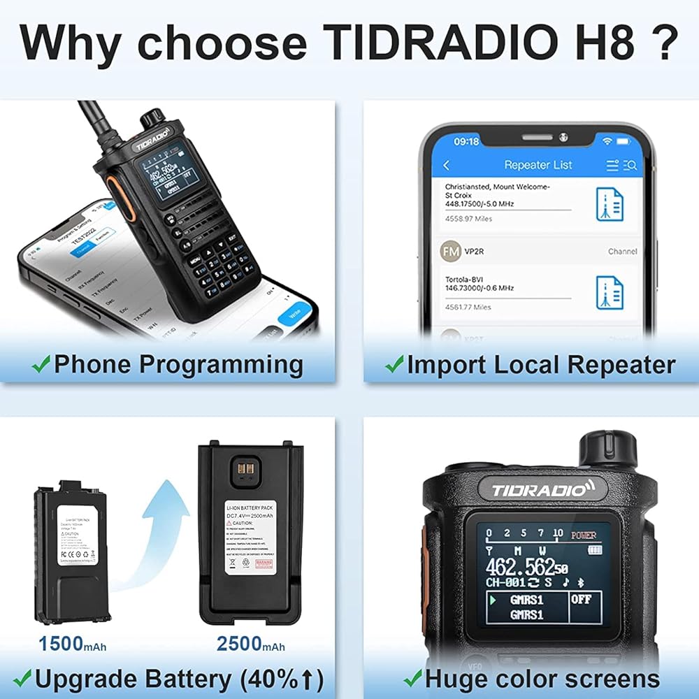 【ترقية راديو TD-H8 GMRS بقدرة 5 وات بناءً على تعليقات المستخدم 】--شهادة 𝗙𝗖𝗖: 2AWL3-TDH8GMRS (رمز الممنوح: 2AWL3 رمز المنتج: -TDH8GMRS)؛ 𝗠𝗶𝗰𝗿𝗼𝗽𝗵𝗼𝗻𝗲 𝗴𝗮𝗶𝗻; الطاقة: منخفض 2 وات/مرتفع 𝟱𝗪؛ قبضة معززة 𝘁𝗲𝘅𝘁𝘂𝗿𝗲; تحسين سرعة وصلات البلوتوث. نحن نعمل باستمرار على تحسين وتحديث المزيد من الميزات